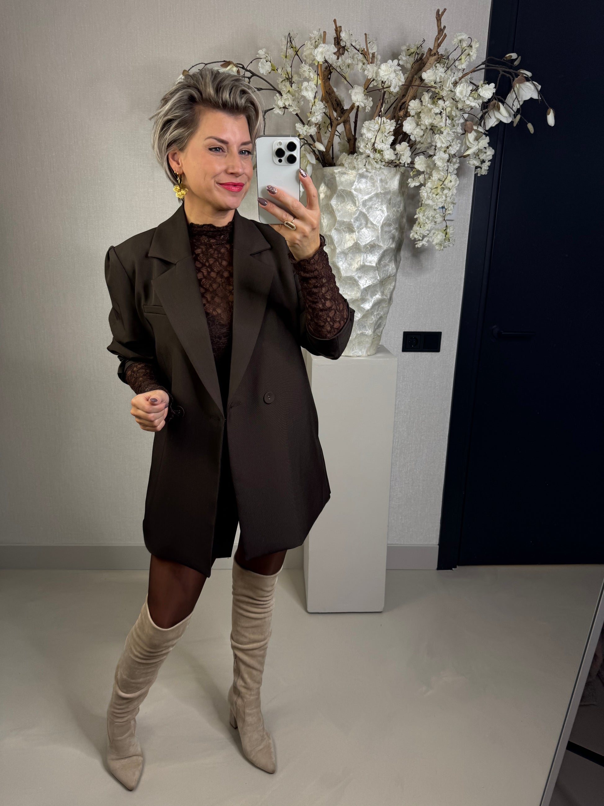 Oversized blazer met bijpassend ceintuur, de blazer is zowel open als dicht casual te dragen en heeft leuk detail de knoopjes op de mouwen, de blazer is verkrijgbaar in de maten S/M en M/L