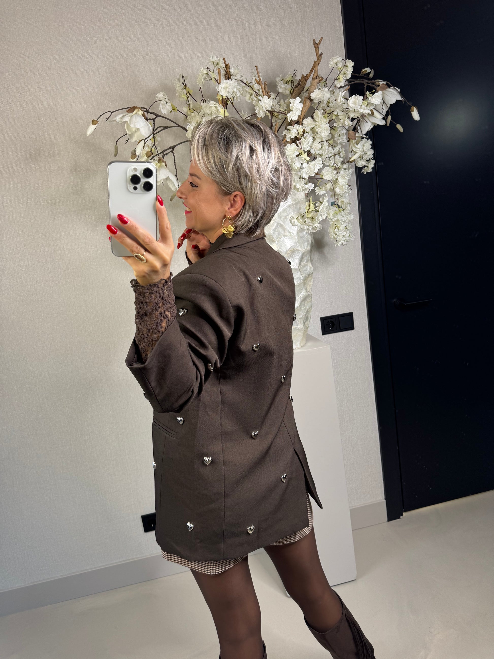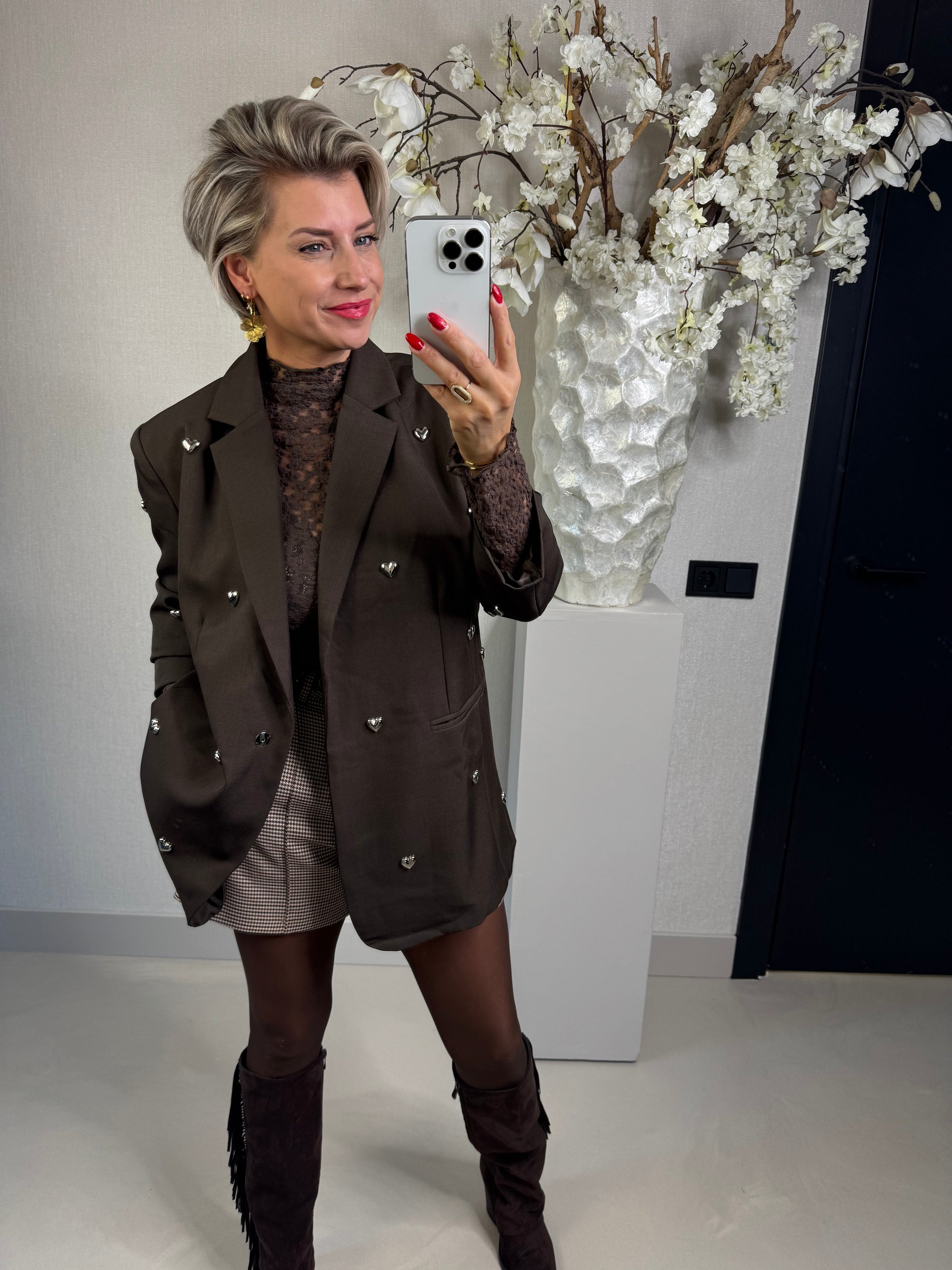 Oversized blazer met all over zilveren hartjes, de blazer is gevoerd en heeft een splitje aan achterkant, combineer deze met een top of stoer met een blouse! de blazer is dus oversized en valt ruimer, verkrijgbaar in de maten S/M en M/L Annelies draagt hier de maat S/M