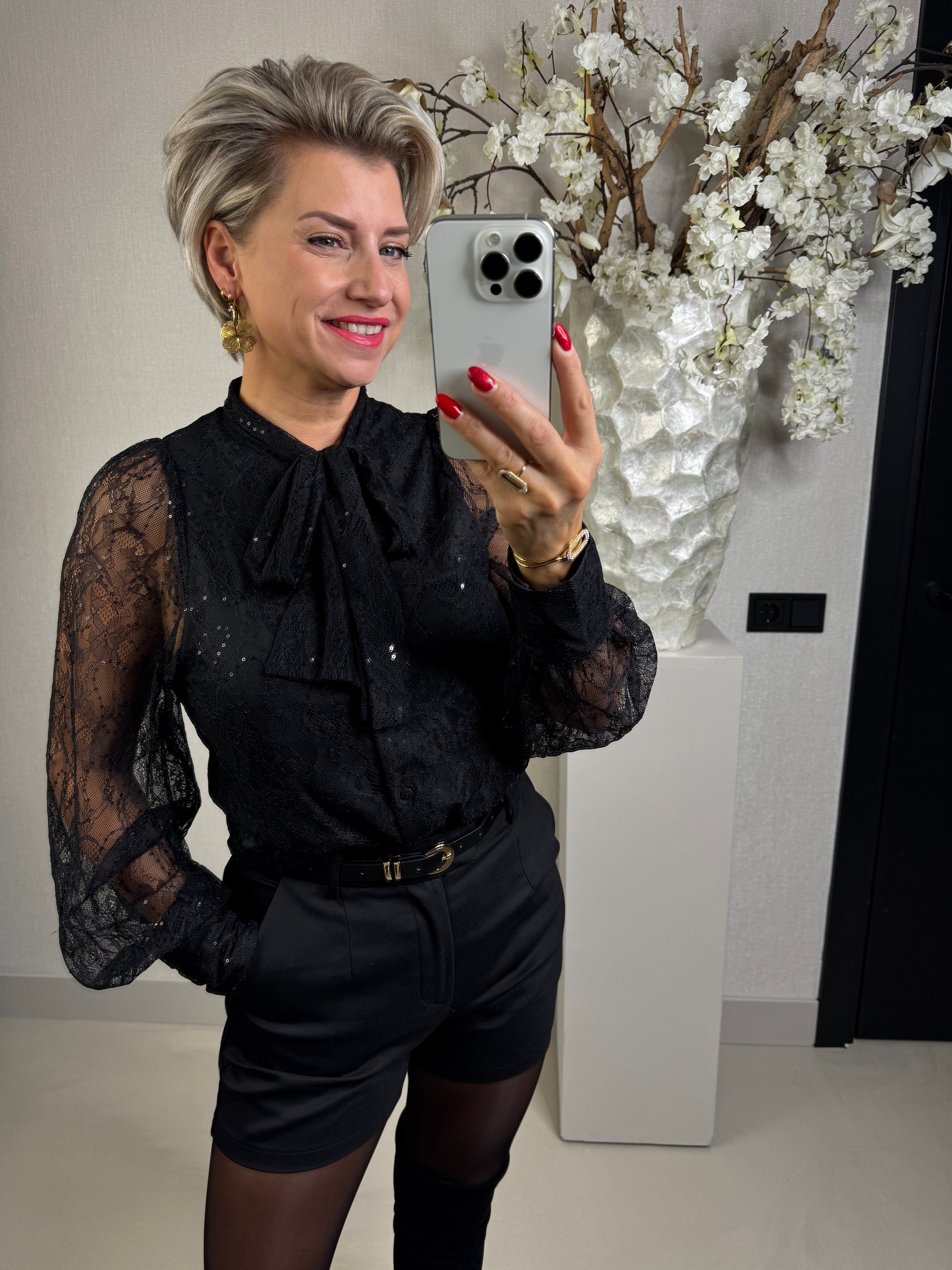 Deze prachtige blouse is gemaakt van kant met subtiele glitterdetails die een luxe uitstraling geven. De transparante mouwen zorgen voor een vrouwelijke, elegante look, terwijl de strik bij de hals een stijlvolle en tijdloze touch geeft, valt normaal op maat en is verkrijgbaar in de maten S, M en L Annelies draagt hier de maat S
