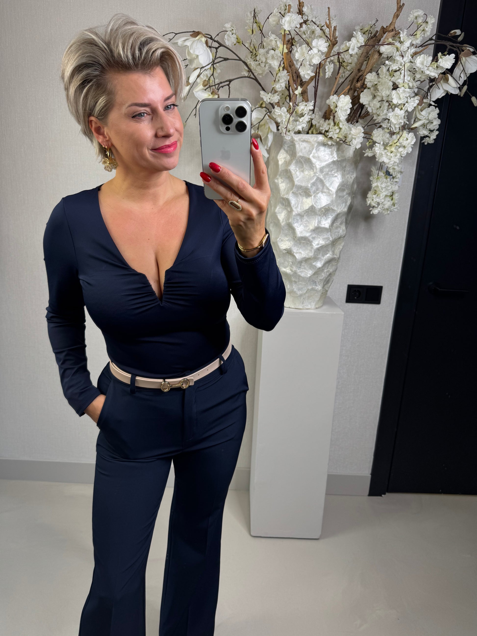 Body top van travelstof met een mooie V-hals, de body top is een stringmodel en verkrijgbaar in de maten S, M en L Annelies draagt hier de maat L