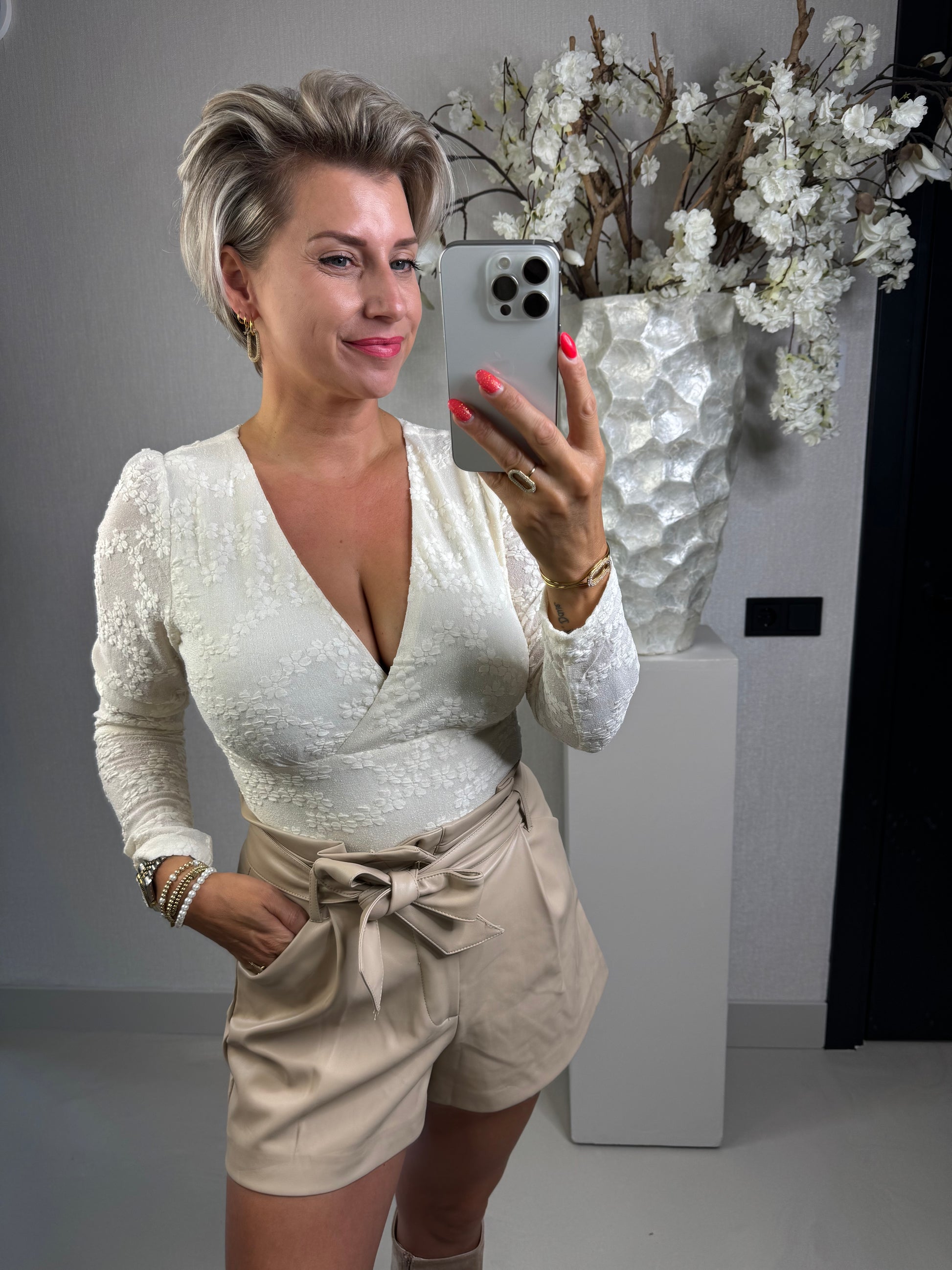 Body top Ramone met een mooie V-hals en een leuk brocant printje, de top is verkrijgbaar in de maten S/M en M/L Annelies draagt hier de maat M/L