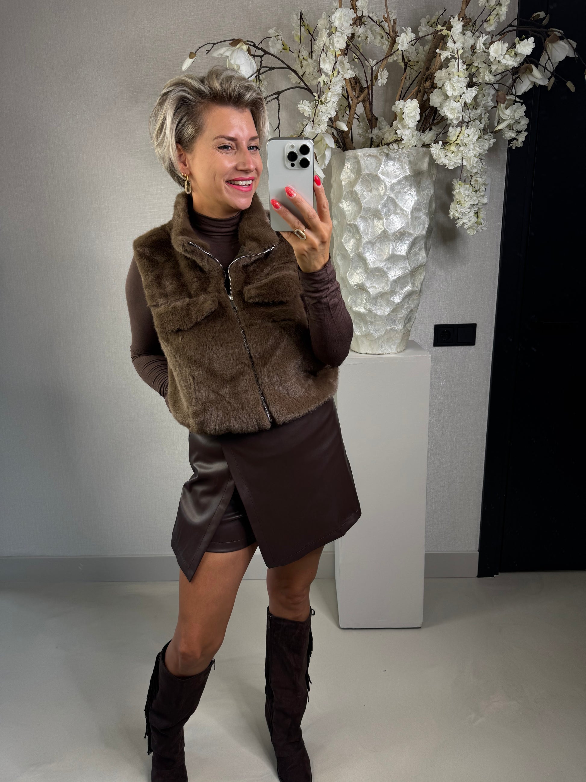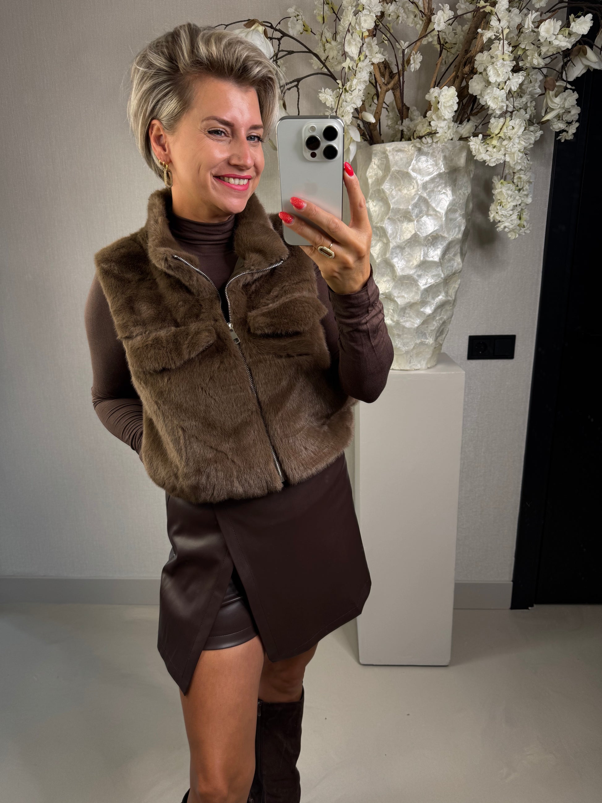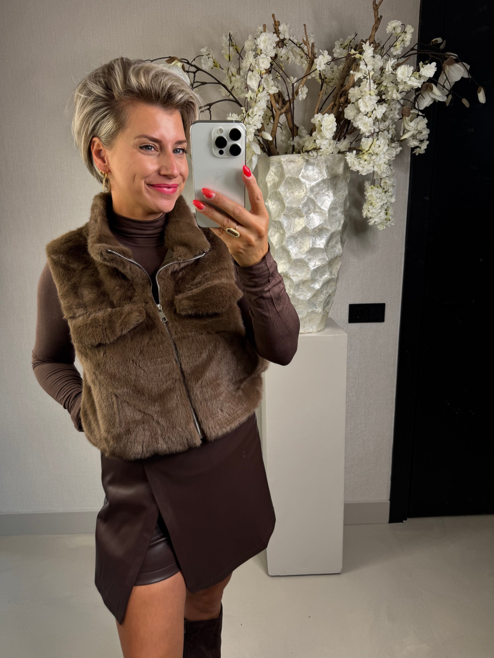 Ze zijn weer terug! onze favoriete bont bodywarmers, met ritssluiting twee klepzakjes voor slechts voor detail, en steekzakjes, de bodywarmer bevat elastiek aan de onderkant en is verkrijgbaar in de maten S/M en M/L. Annelies draagt hier de maat S/M