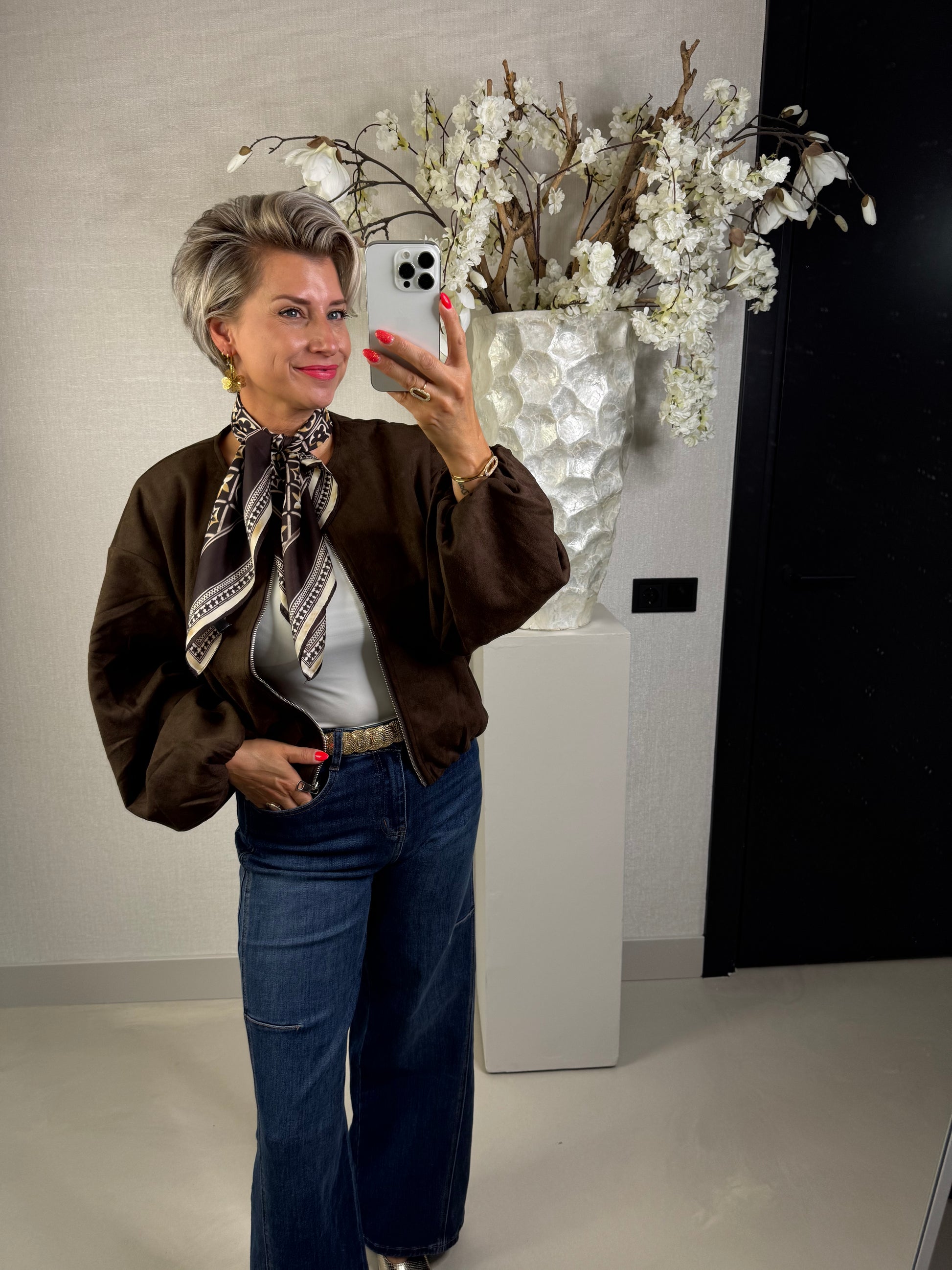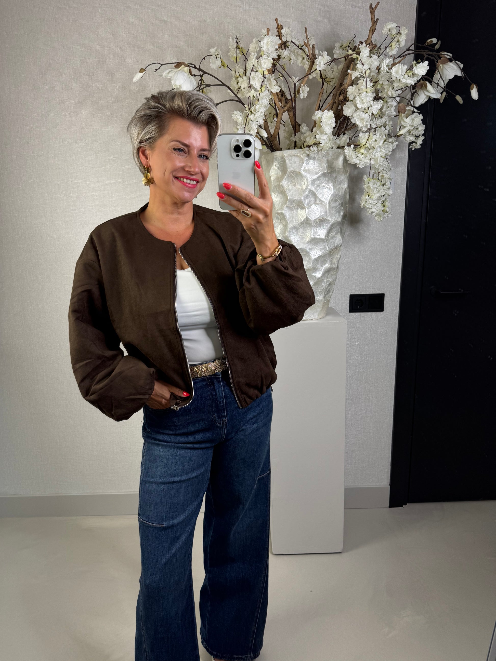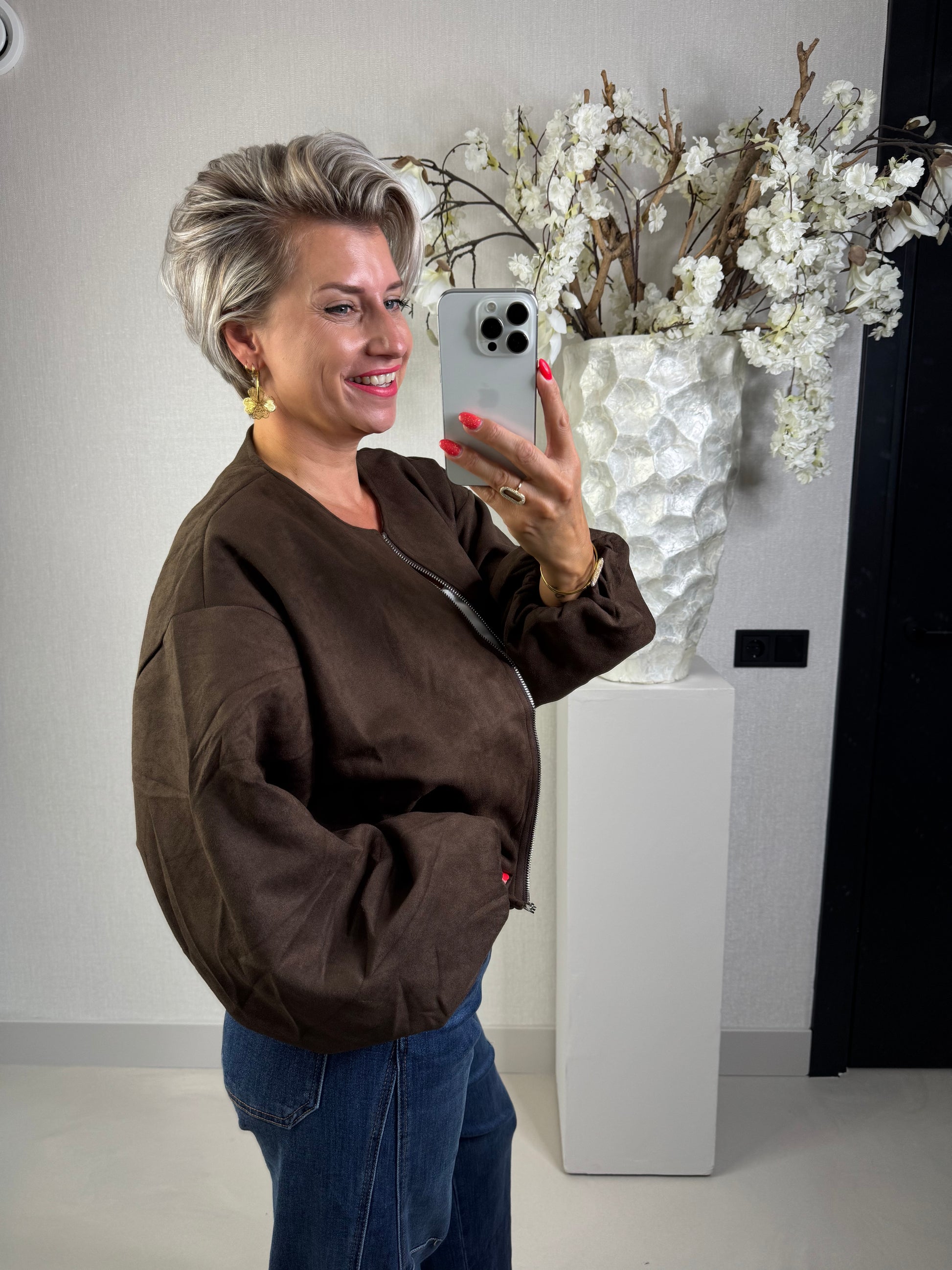 Bomber jacket met ballonmouwen in suede stof, bevat elastiek bij de mouwen en heeft zakken, de jas is verkrijgbaar in de maten S, M en L Annelies draagt hier de maat S