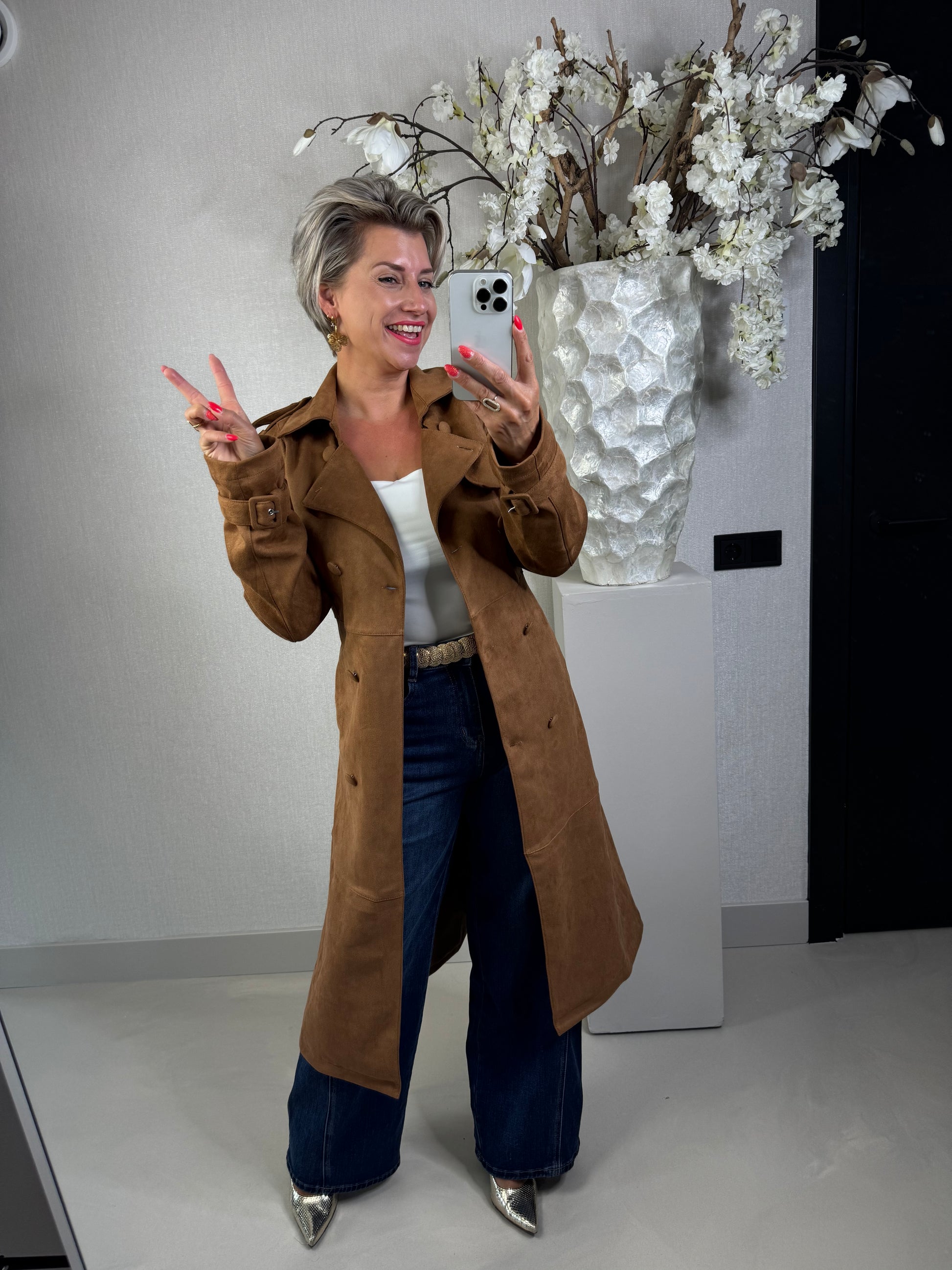 Elegante jas met een klassieke uitstraling. Voorzien van knopen aan de voorkant en een ceintuur om taille te creëren, ook is deze jas mooi om open te dragen, de reverskraag geeft de jas een tijdloze, chique look die moeiteloos combineert met zowel casual als formele outfits.” valt normaal op maat en is verkrijgbaar in de maten S, M en L Annelies is 1,63 en draagt hier de maat S