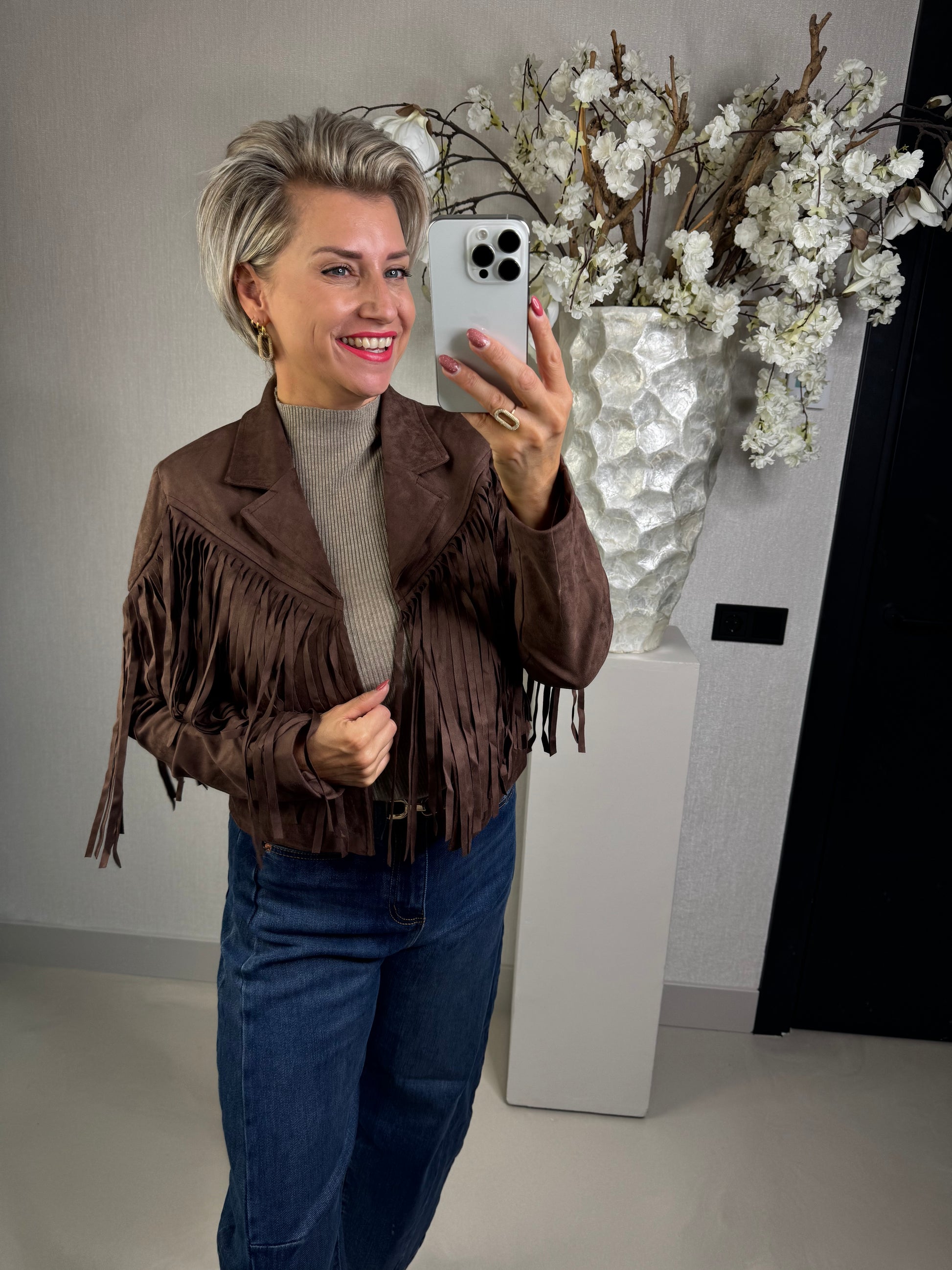 Jas van suede stof met franjes! de binnenkant is satijn gevoerd en de jas valt normaal op maat, verkrijgbaar in de maten S, M en L Annelies draagt hier de maat S