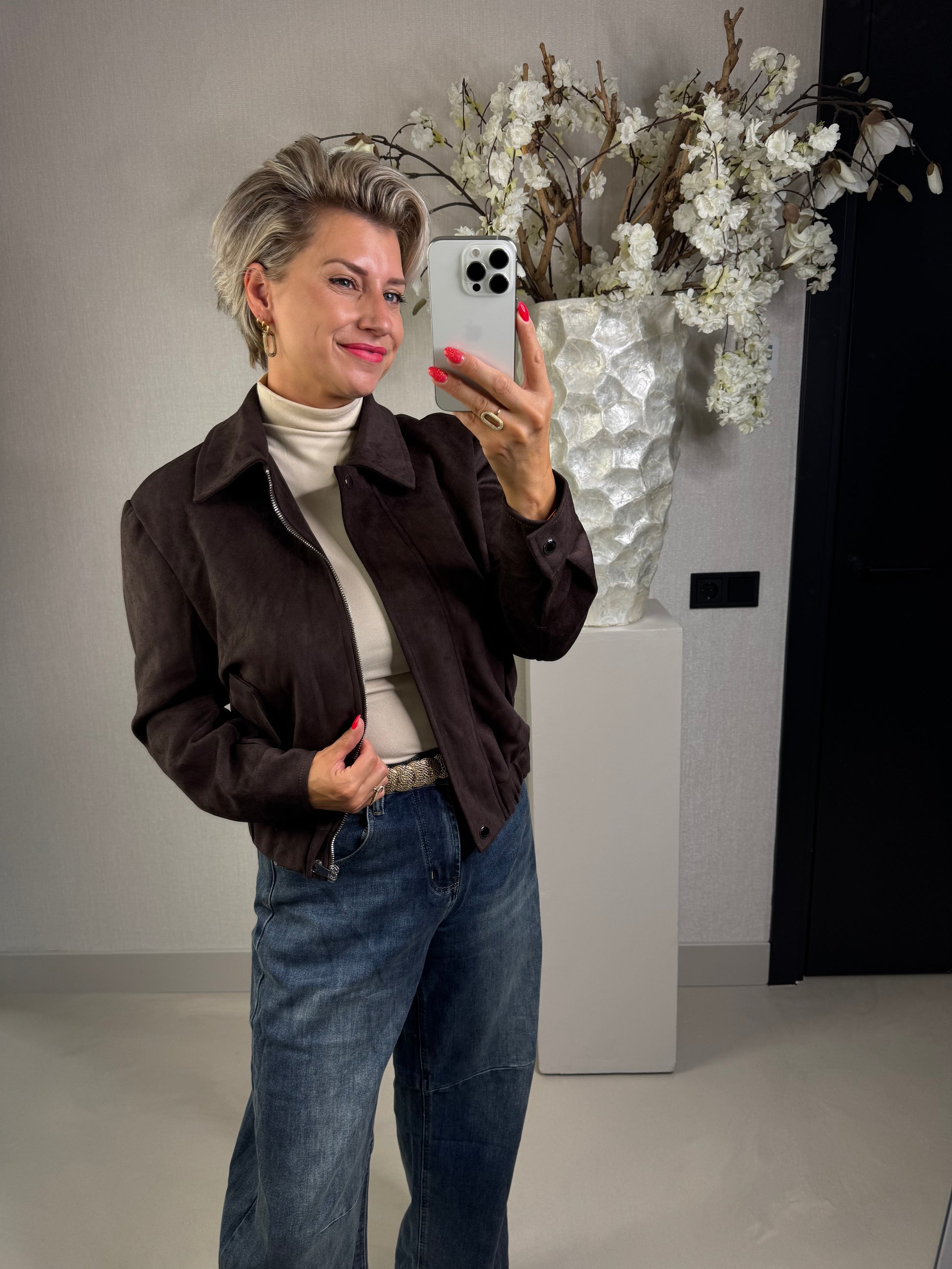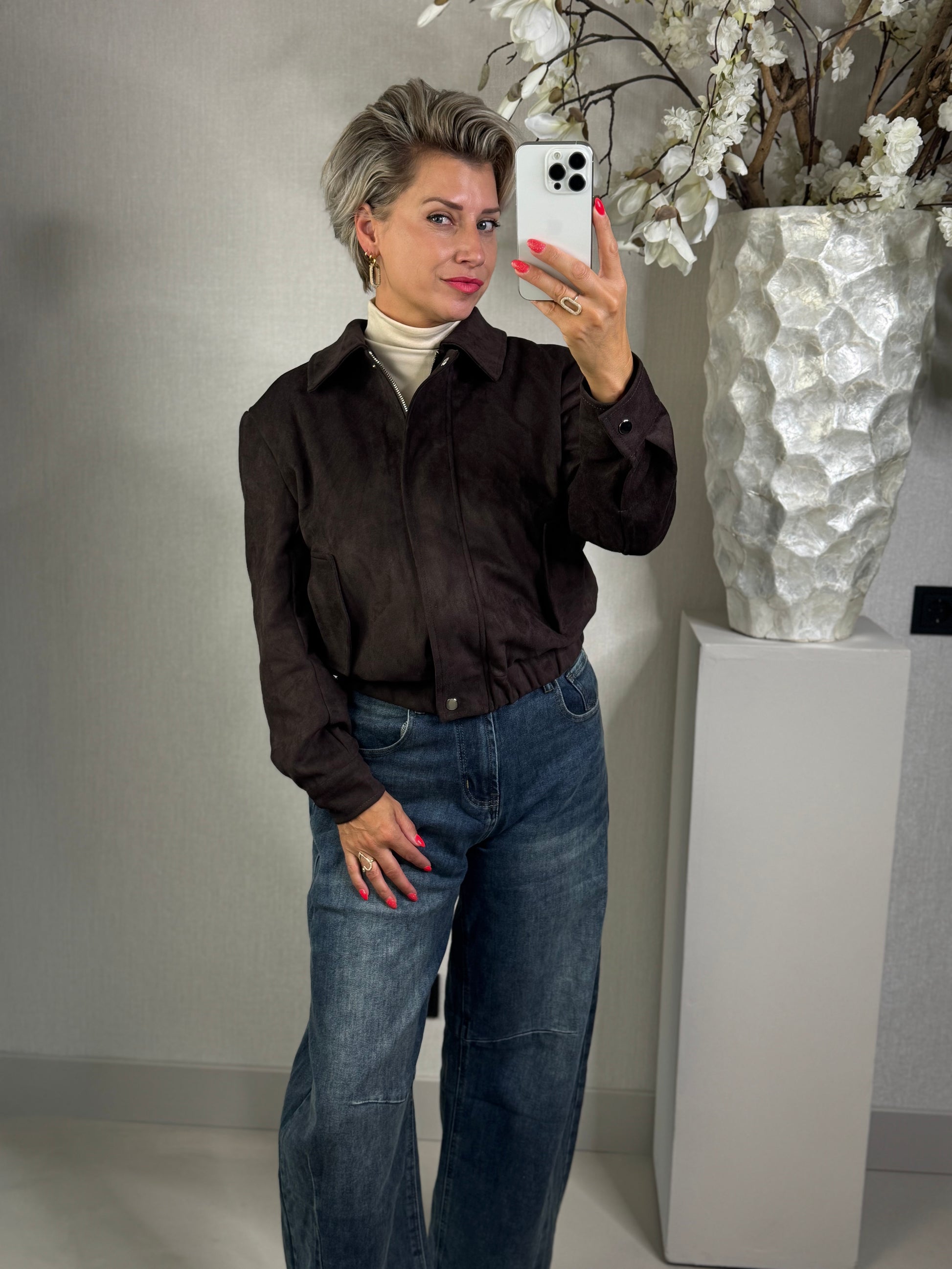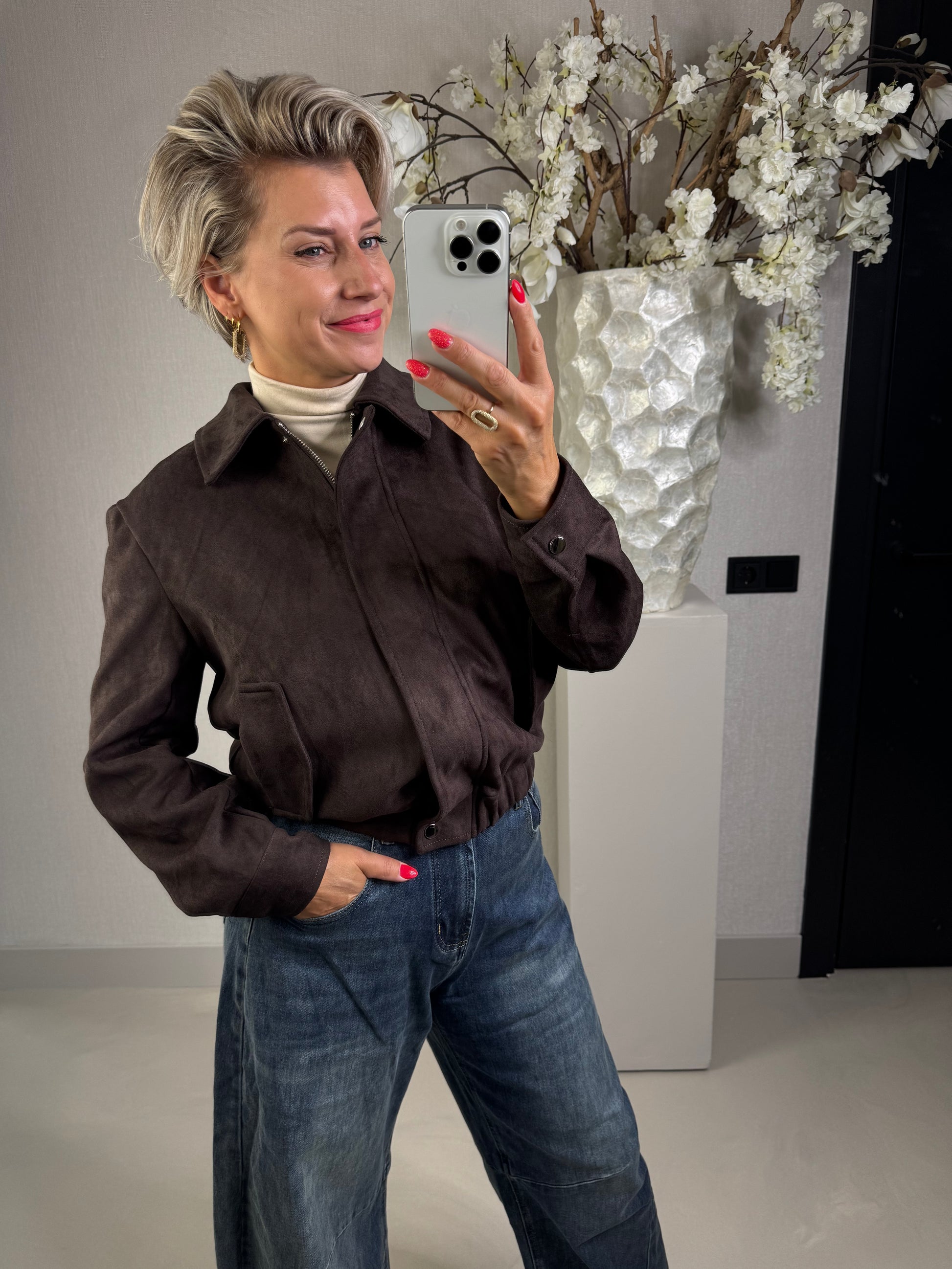 Jas van suedine stof in het prachtige donker bruin! de jas is gevoerd, bevat elastiek in de boord en is voorzien van steekzakken, valt normaal op maat en is verkrijgbaar in de maten S, M en L. Annelies draagt hier de maat S