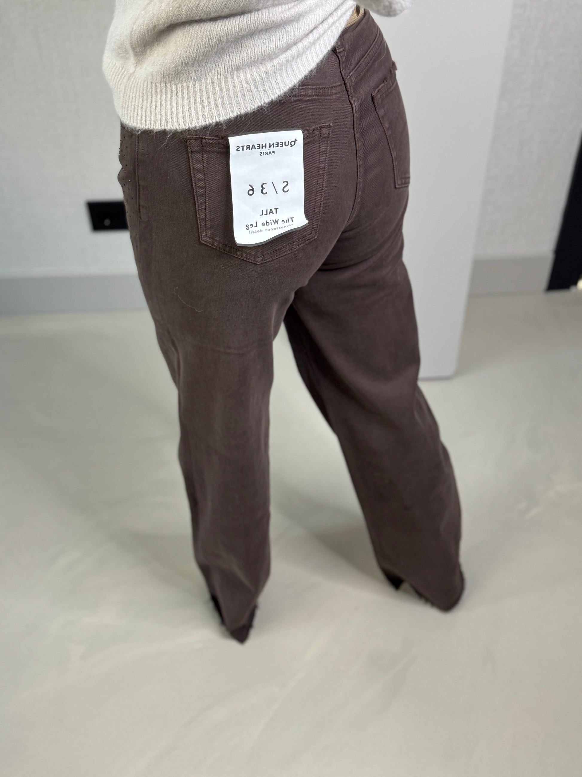 Deze prachtige Queen Hearts jeans in de bruine kleur met subtiele strass steentjes die een sprankelende en luxe uitstraling geven, dankzij de coated finish heeft de broek een moderne, trendy look die zowel casual als chique is te dragen, het is een recht model met comfortabele stretch die mooi aansluit op het lichaam, deze jeans is geschikt voor dames met lange benen! de binnenbeen lengte is 83 cm