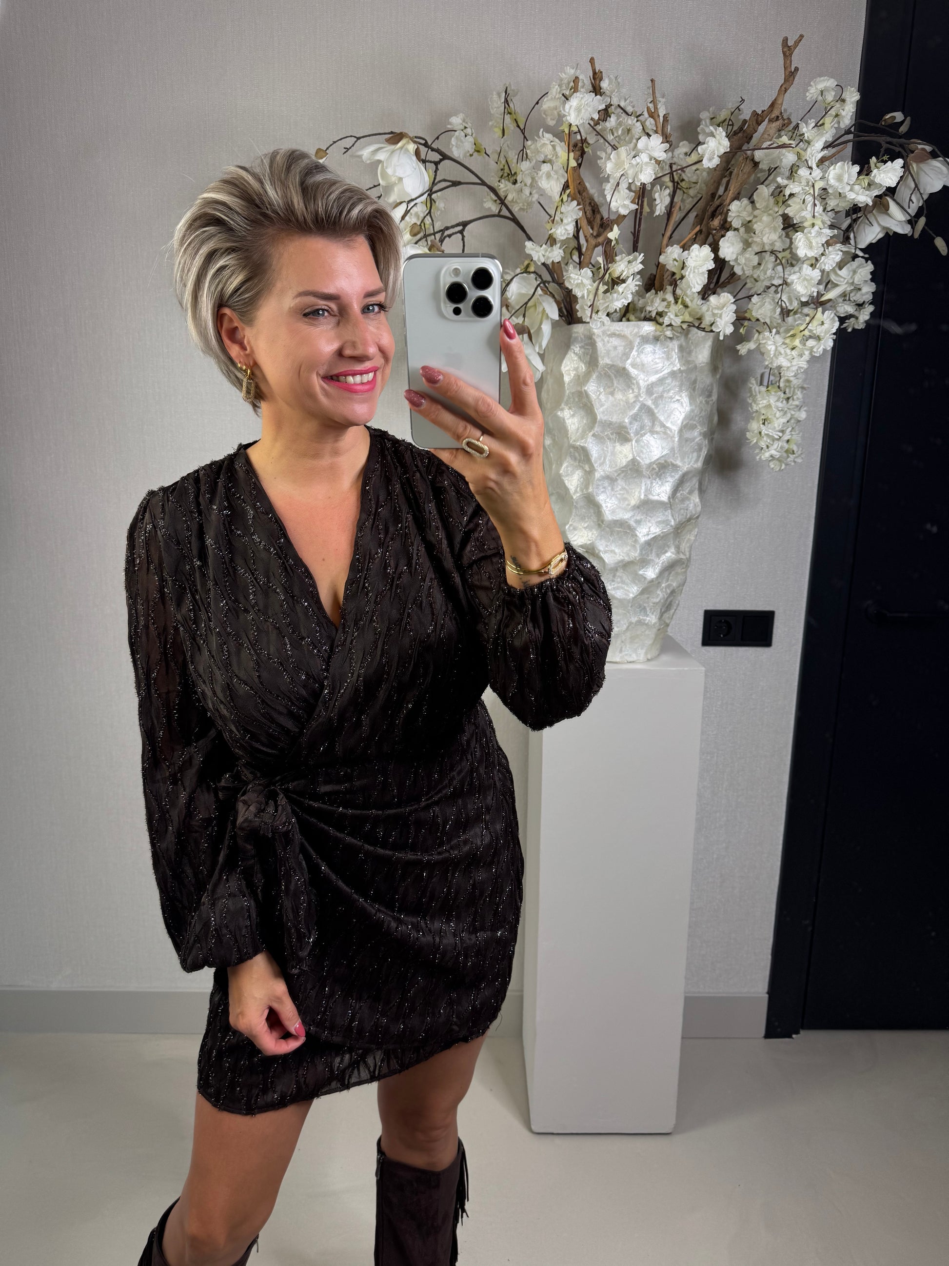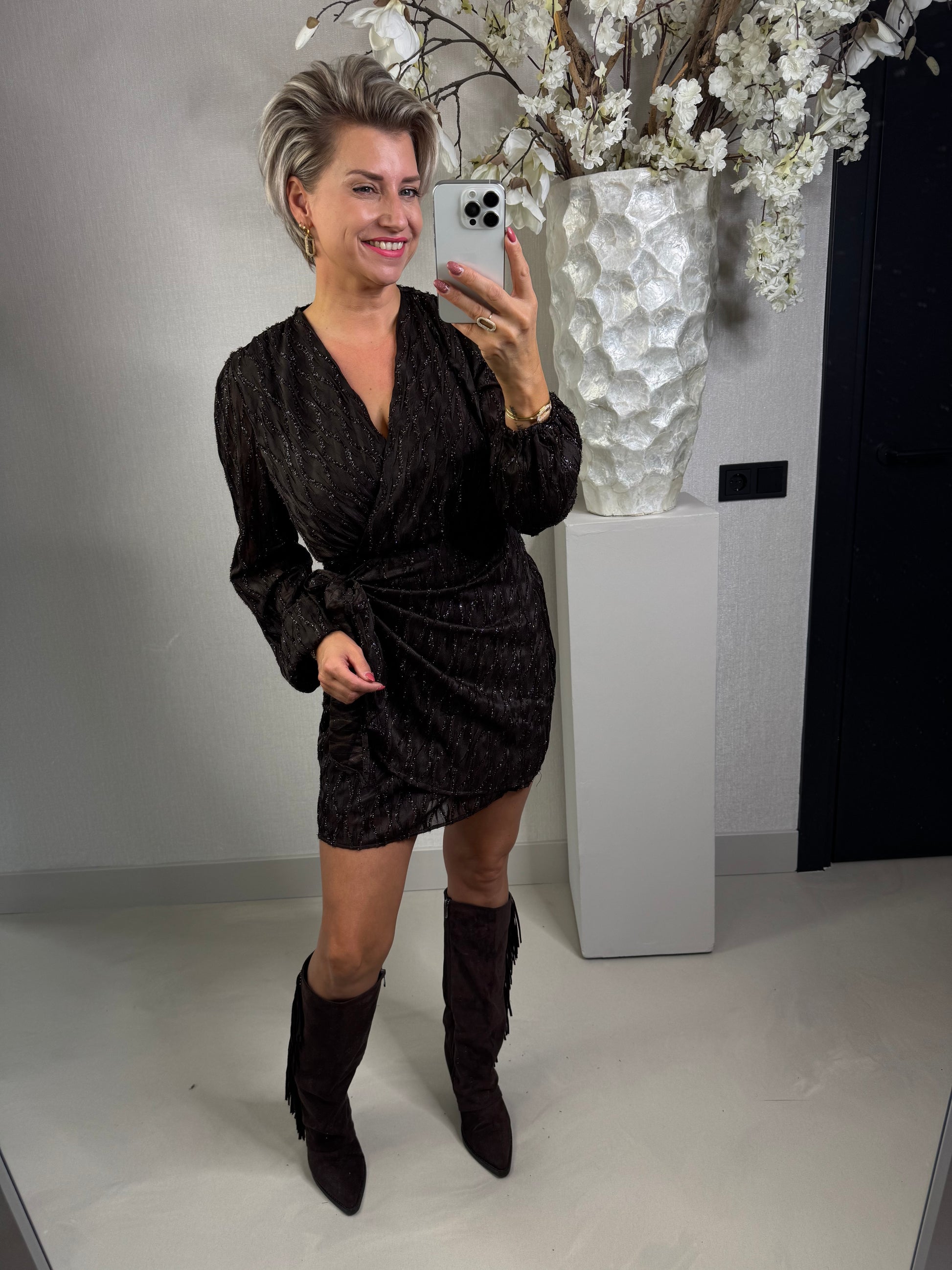 Jurk in een hele donker bruine kleur met als detail glitterdraad, de jurk bevat elastiek in de taille en is gevoerd waardoor deze niet door schijnt, de jurk valt normaal op maat en is verkrijgbaar in de maten S, M en L. Annelies is 1,63 en draagt hier de maat S