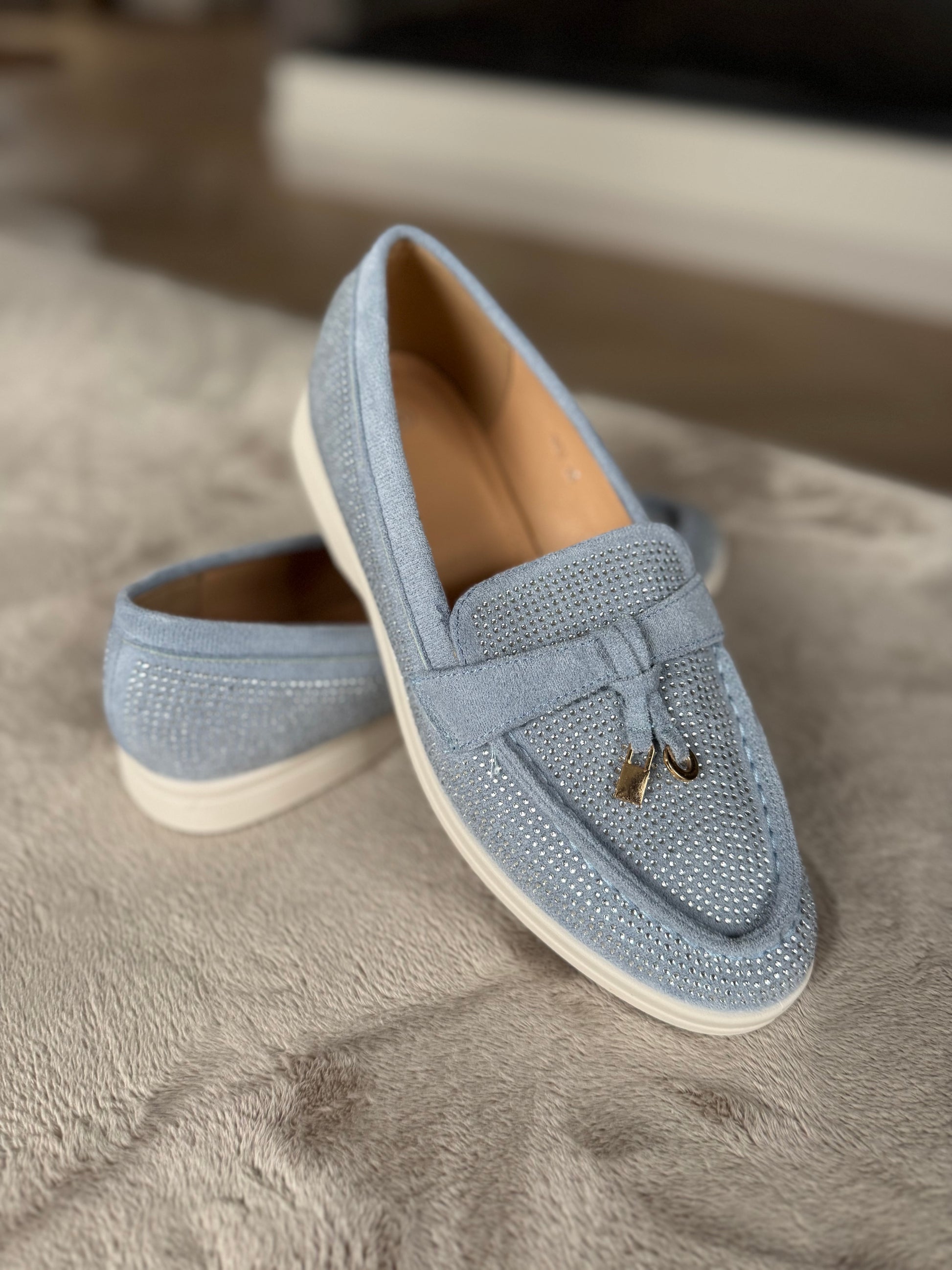 Loafers in een jeans kleur met super gave strass steentjes, de loafers hebben een zacht voetbed en lopen als wolkjes, advies is één maat groter te nemen als je eigen schoenmaat, verkrijgbaar vanaf maat 36 t/m 41