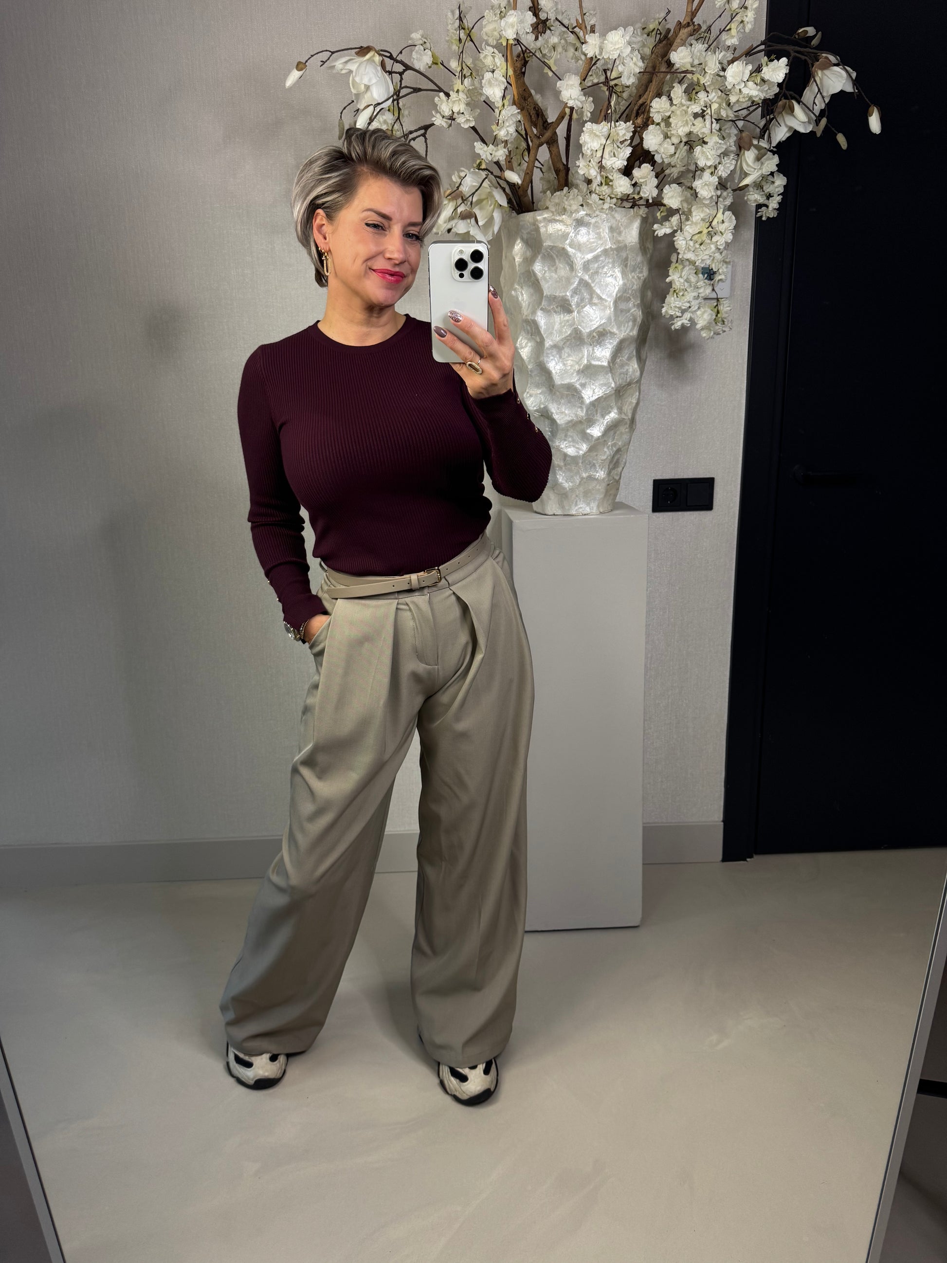 Deze prachtige pantalon heeft subtiele plooien aan de voorkant, wat zorgt voor een verfijnde en moderne look. Dankzij de soepele stof valt hij mooi langs het lichaam en draagt het heerlijk comfy, valt normaal op maat en is verkrijgbaar vanaf maat S t/m XL Annelies is 1,63 en draagt hier de maat S de binnenbeen lengte is 75 cm