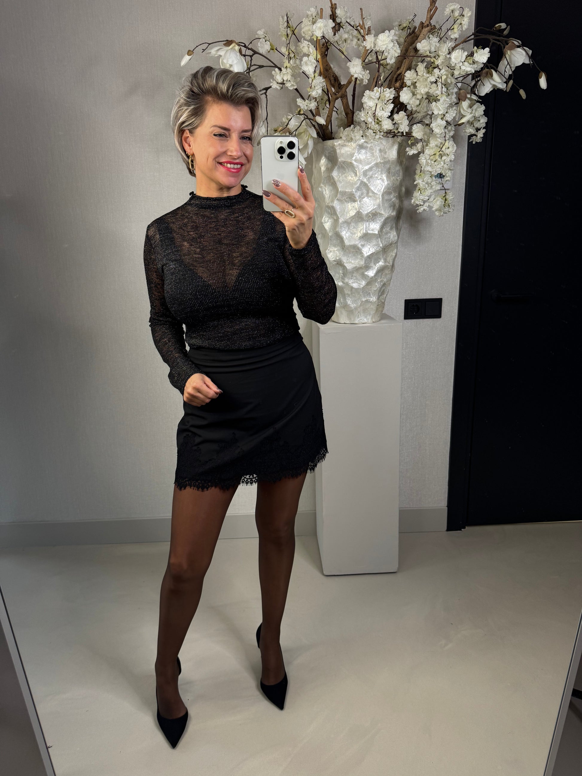 Wauw dit rokje met kant afgewerkt! het rokje is van soepele stof en heeft een rits opzij, combineer dit met een mooie strakke top? of stoer en casual met een comfy trui! verkrijgbaar in de maten S, M en L Annelies is 1,63 en draagt hier de maat M