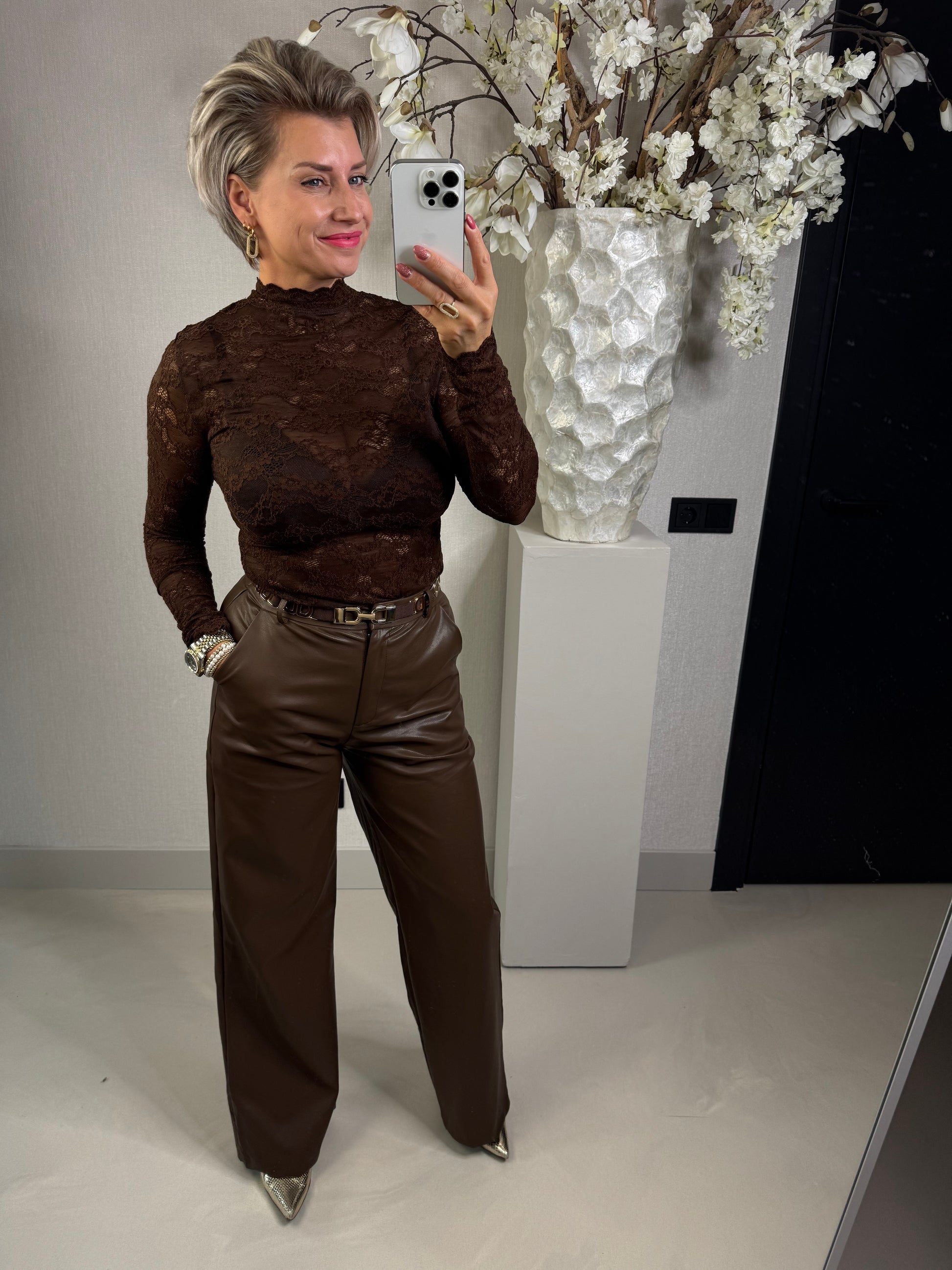Bruine kanten top met lange mouwen en doorzichtige afwerking, de stof heeft een bloemen patroon met een elegante, vrouwelijke uitstraling, de top bevat stretch en is verkrijgbaar in de maten S/M en M/L Annelies draagt hier de maat M/L