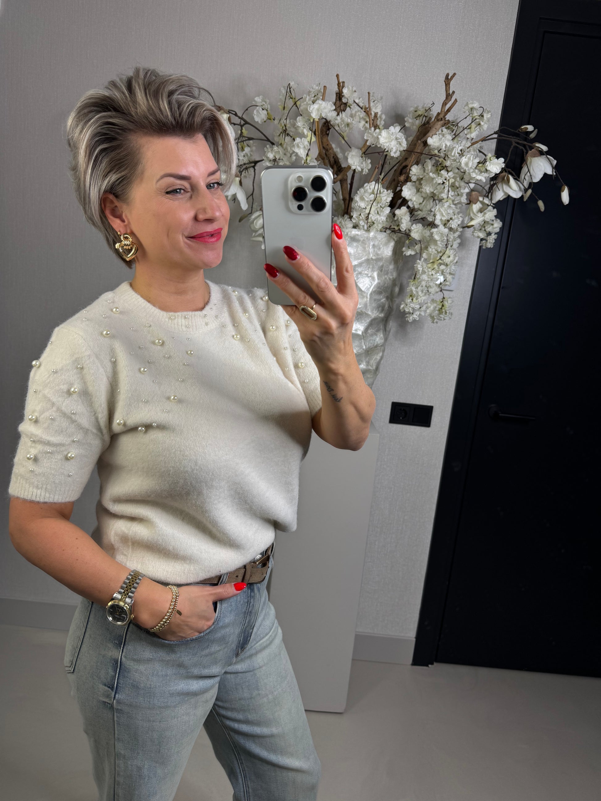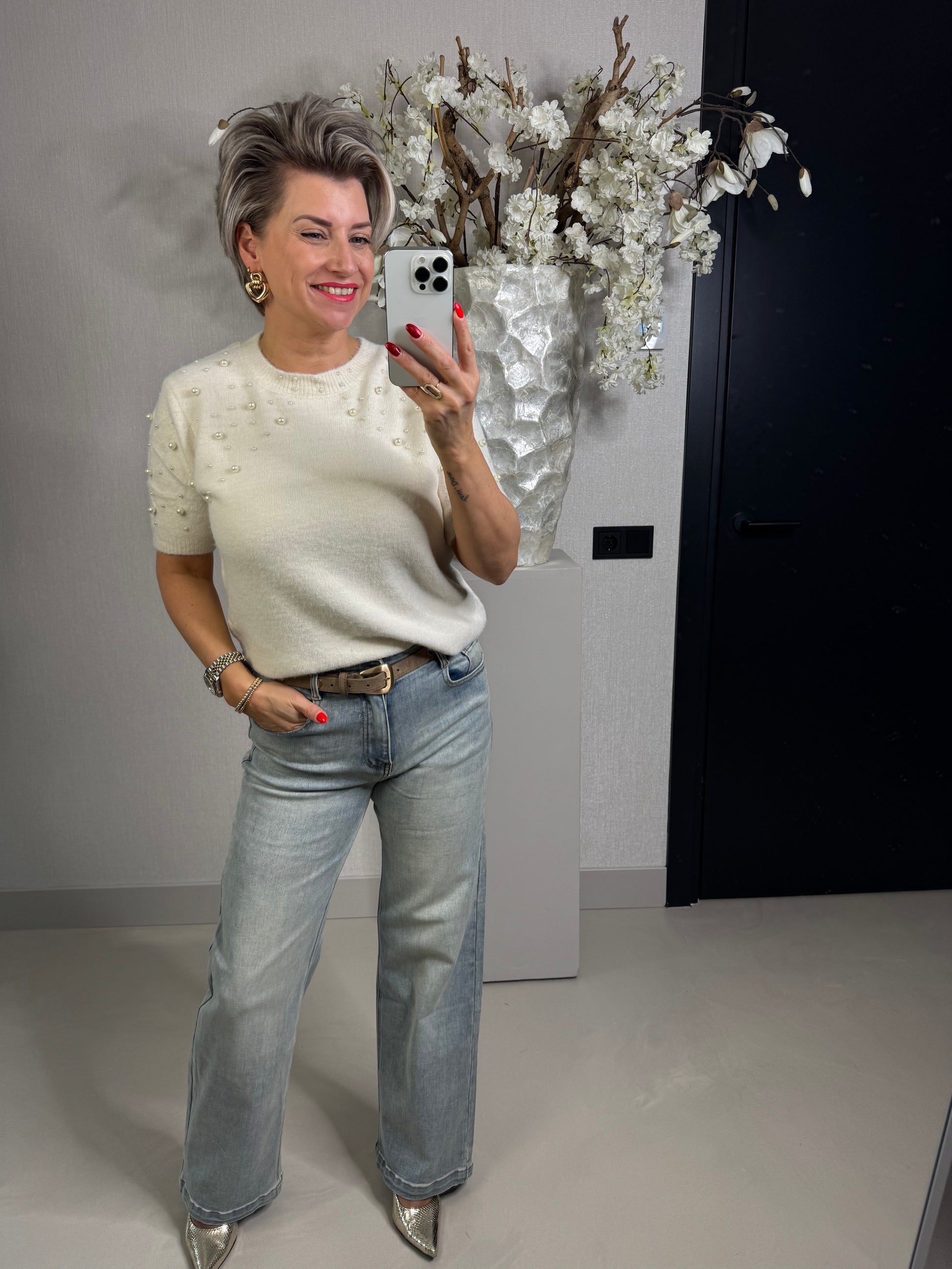 Heerlijk zacht is deze prachtige top in off white met kort mouwtje, ook leuk om evt te combineren met een kanten top eronder of stoer met een blazer, door de parels geeft deze top net even die extra elegante touch! de top is één maat en past tot een maat L/40