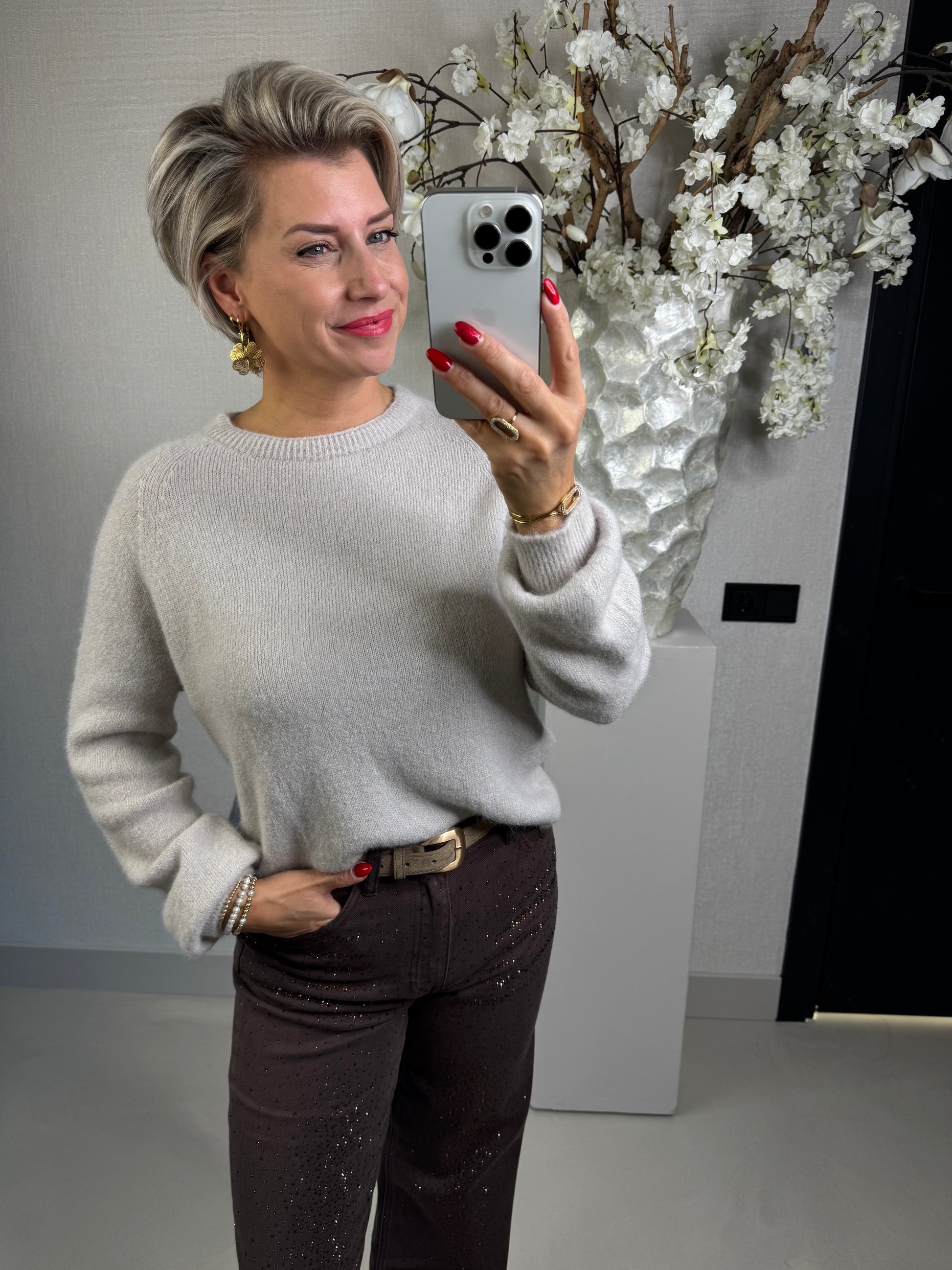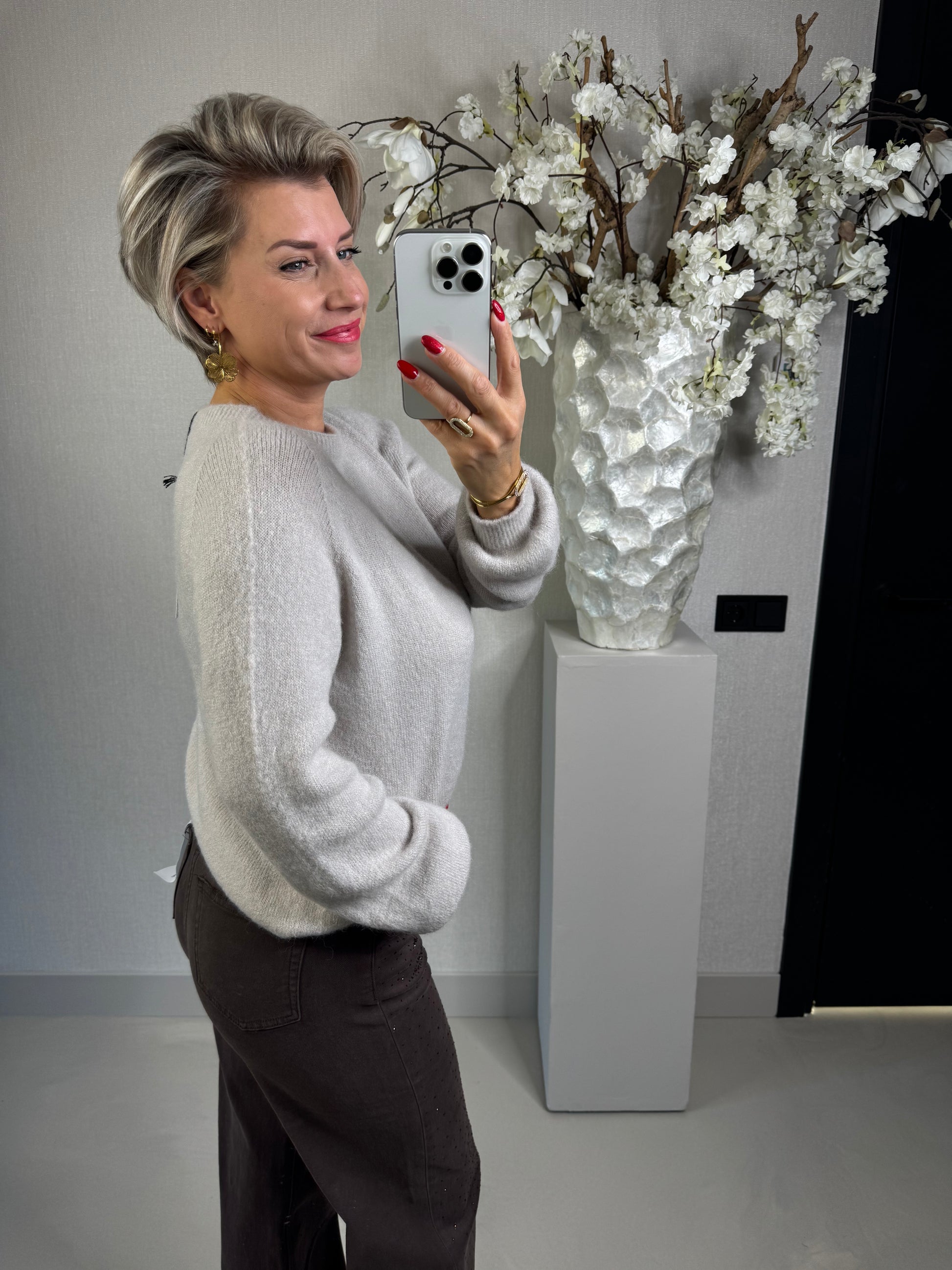 Fijn gebreide trui met alpaca, de trui is heerlijk zacht en kriebelt niet ook heel leuk om bijv met een blouse eronder te combineren, de trui is één maat en past tot een maat 40/42