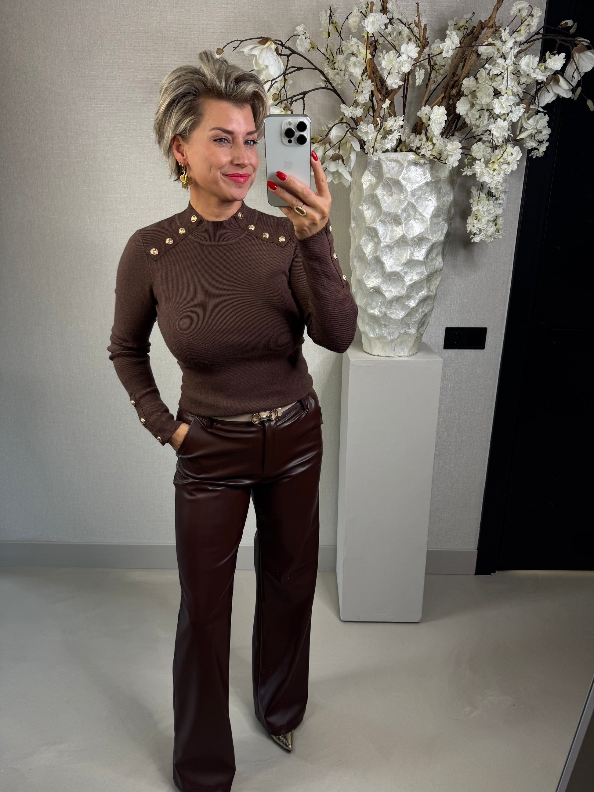 Fijn gebreide basic trui, maar door de gouden knopen toch net even die extra vrouwelijke touch eraan, de trui is één maat en past tot een maat 40