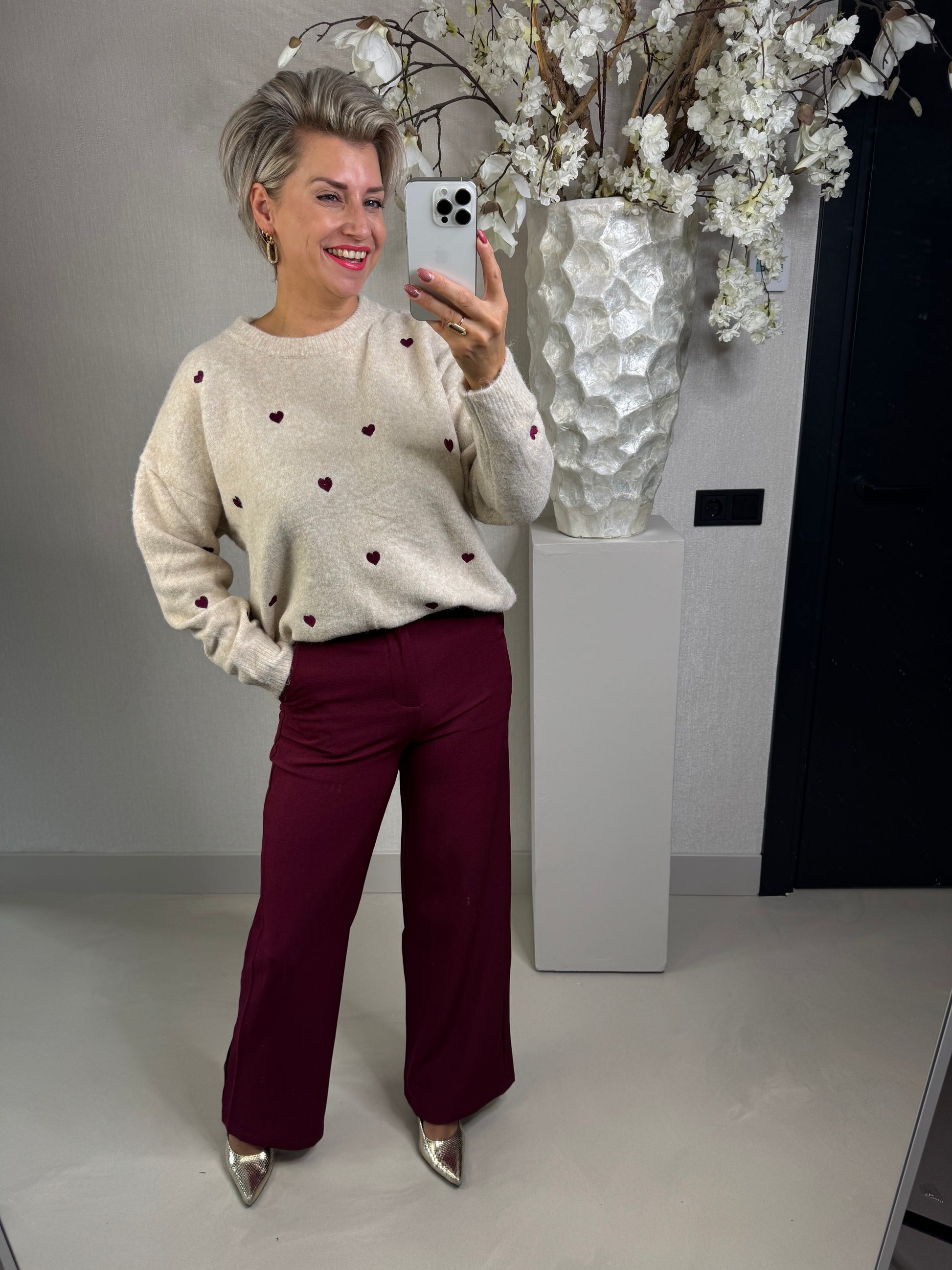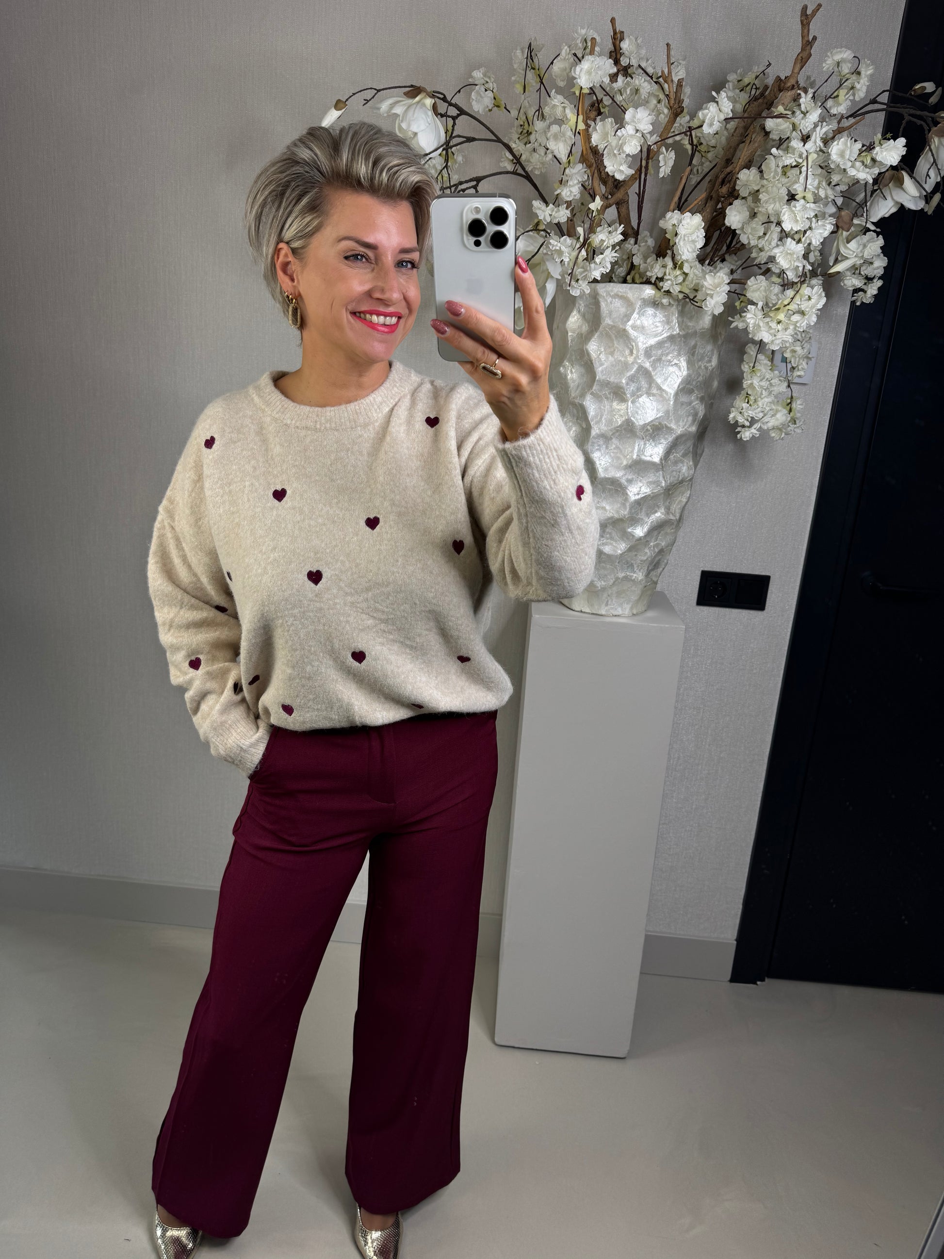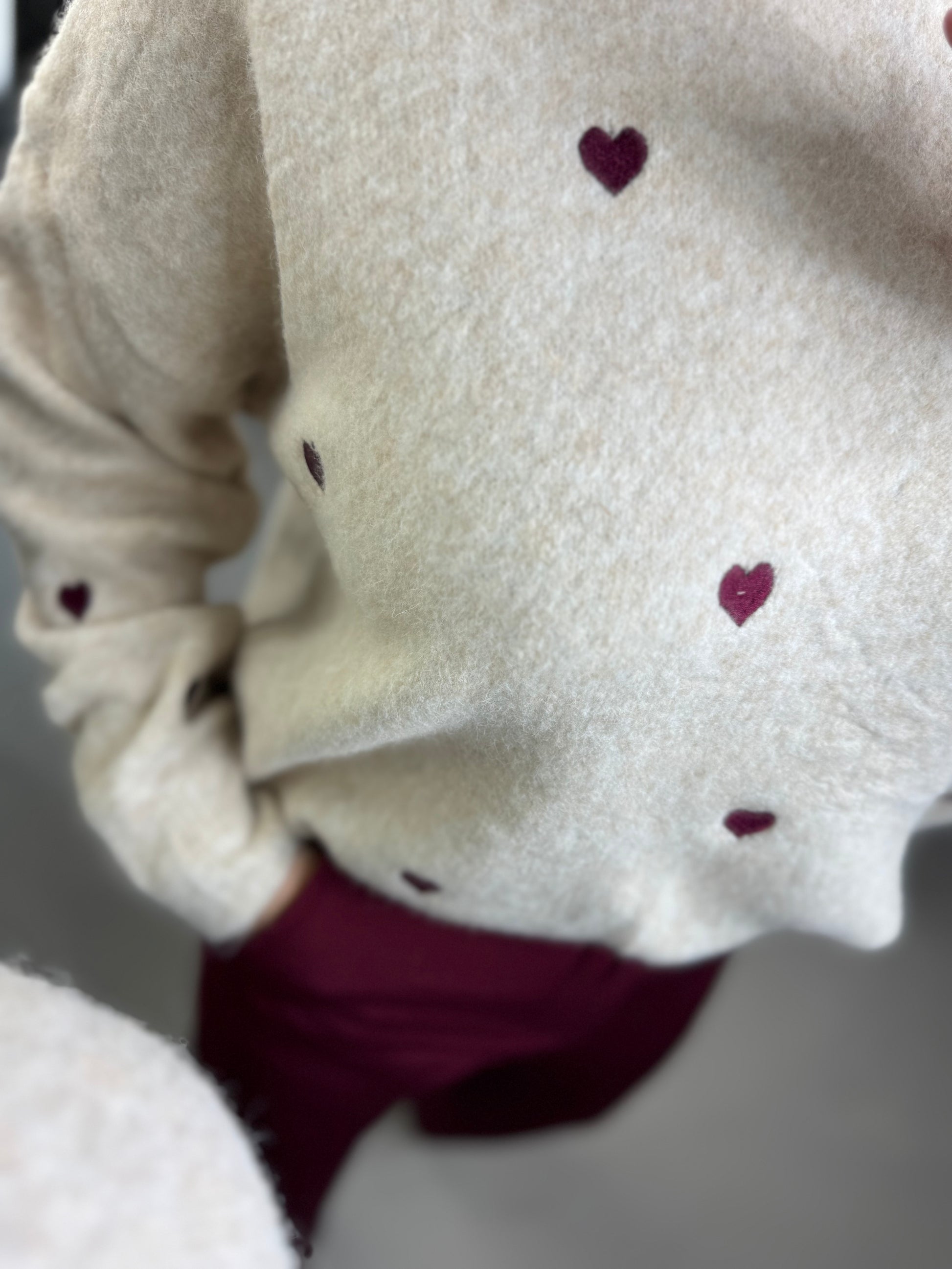 Deze zacht gebreide trui straalt warmte en charme uit door de schattige hartjes die erin zijn verwerkt, de trui heeft een comfy losse pasvorm en een ronde halslijn, ideaal voor een casual maar stijlvolle look! de trui is één maat en past tot een maat 40/42