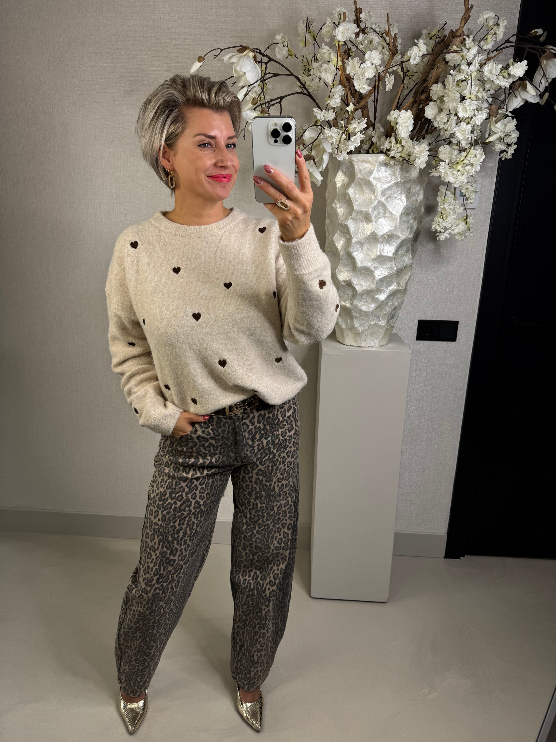 Deze zacht gebreide trui straalt warmte en charme uit door de schattige hartjes die erin zijn verwerkt, de trui heeft een comfy losse pasvorm en een ronde halslijn, ideaal voor een casual maar stijlvolle look! de trui is één maat en past tot een maat 40/42