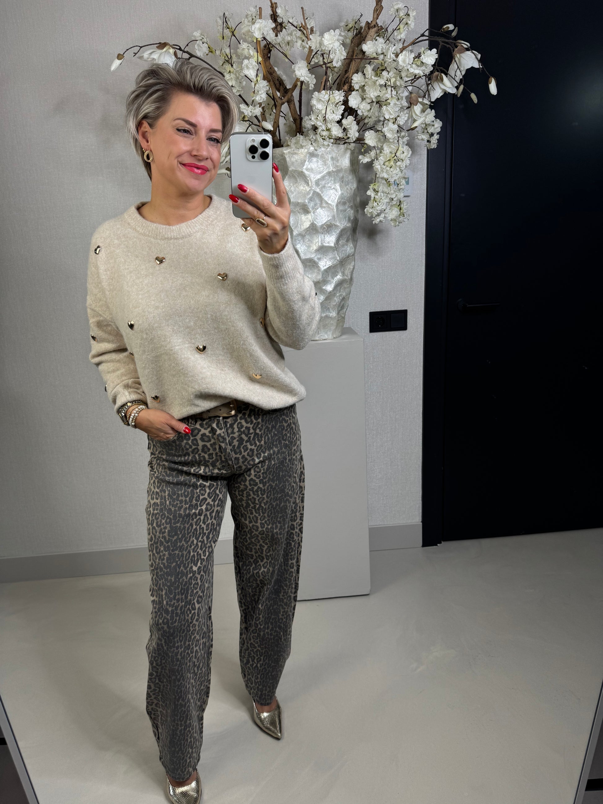 Comfy trui met gouden hartjes, de trui is heerlijk zacht, warm en kriebelt niet, de trui is één maat en past tot een maat 42/XL