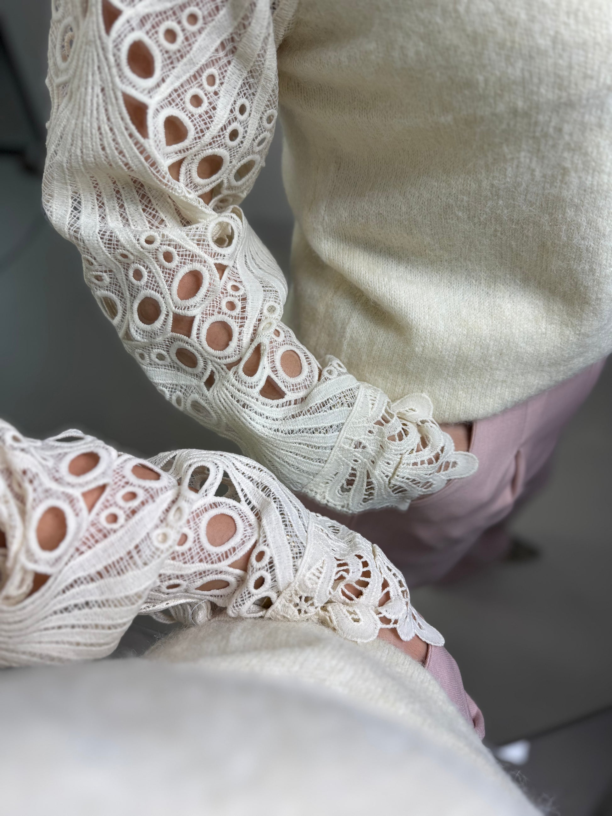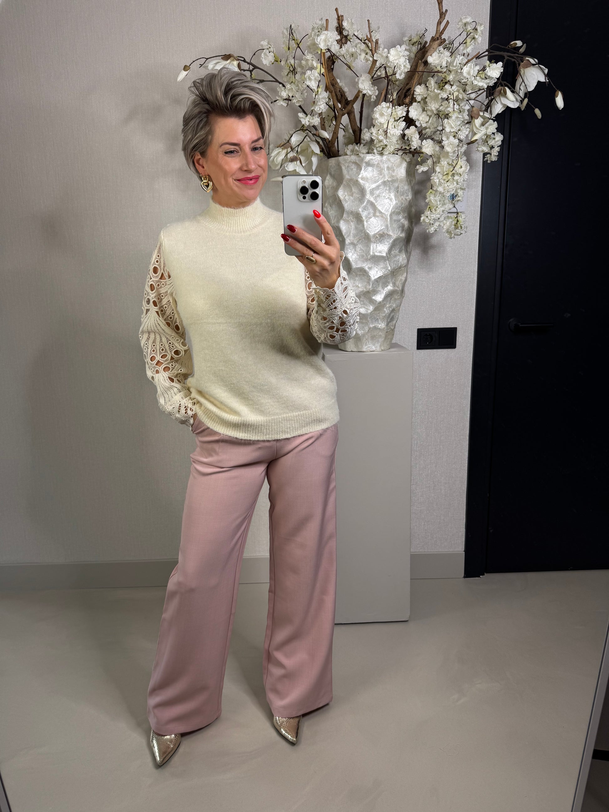 Trui Iris met prachtige kanten mouwen en afgezet met parel knoopjes, de trui is heerlijk zacht heeft een opstaand boordje en is één maat, past tot een ruime maat 40/L