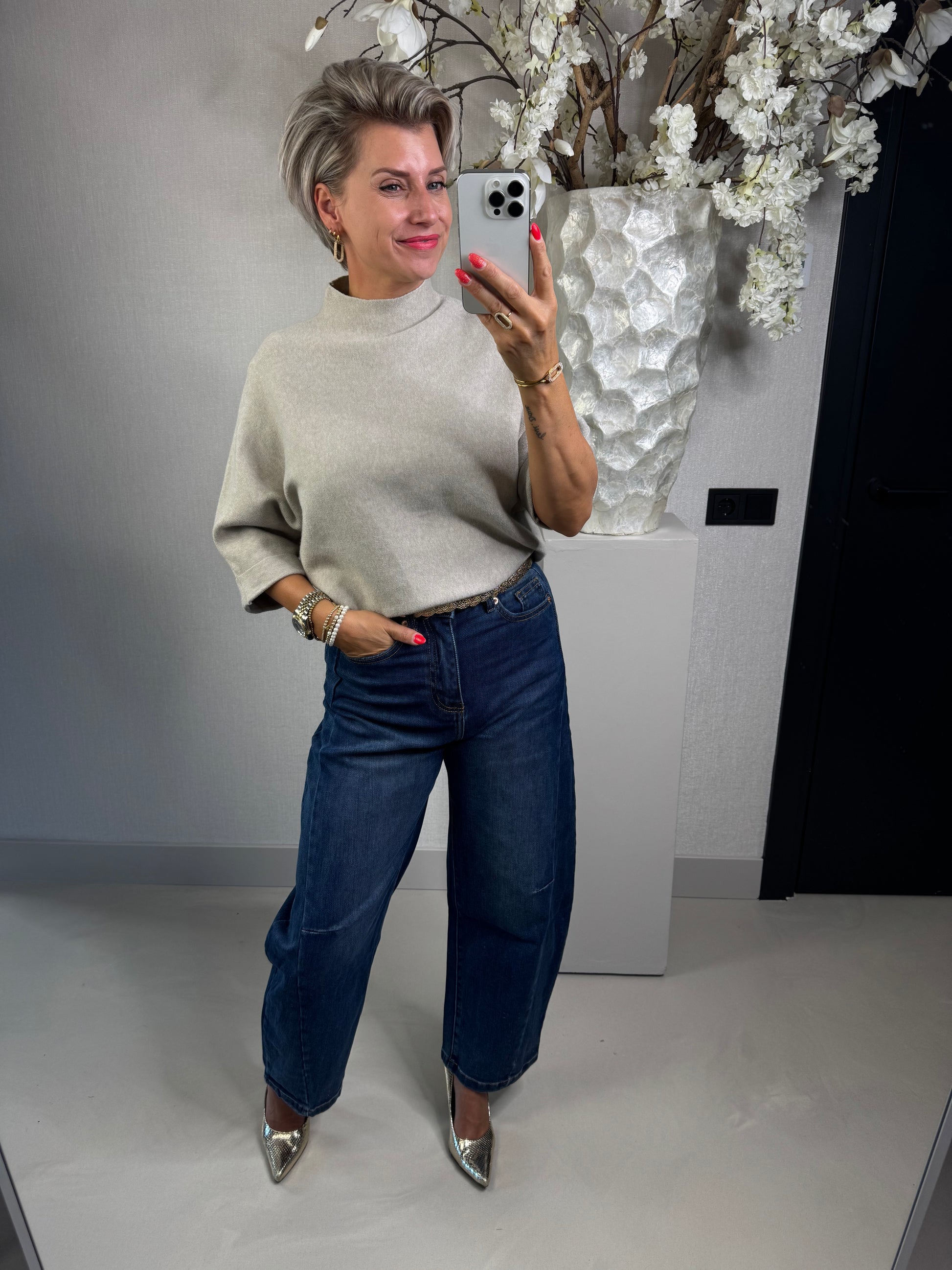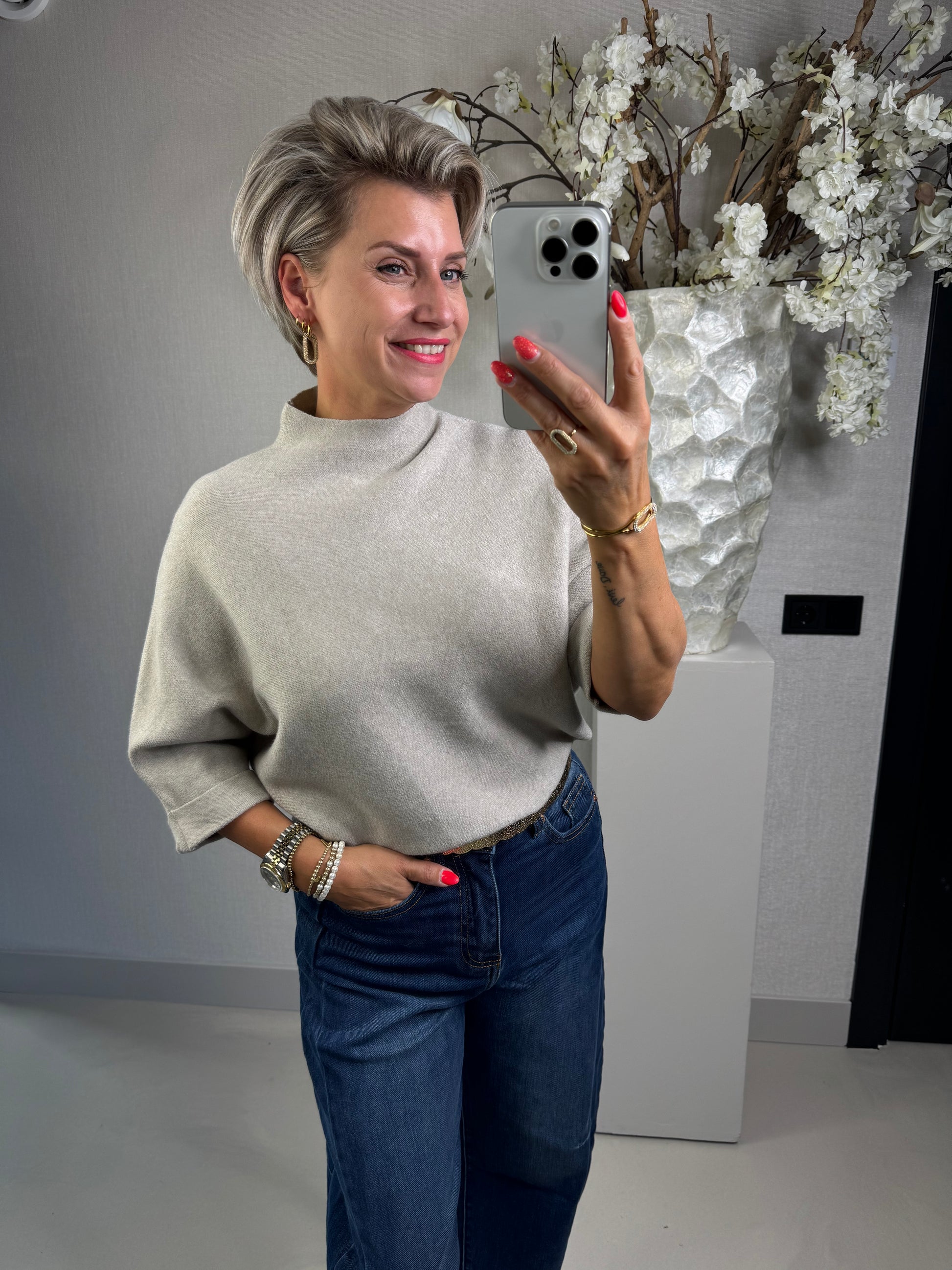 Comfy trui met opstaand boordje, iets een vlinder mouw en een boordje bij de mouwen, de trui is één maat en past tot een maat L/40