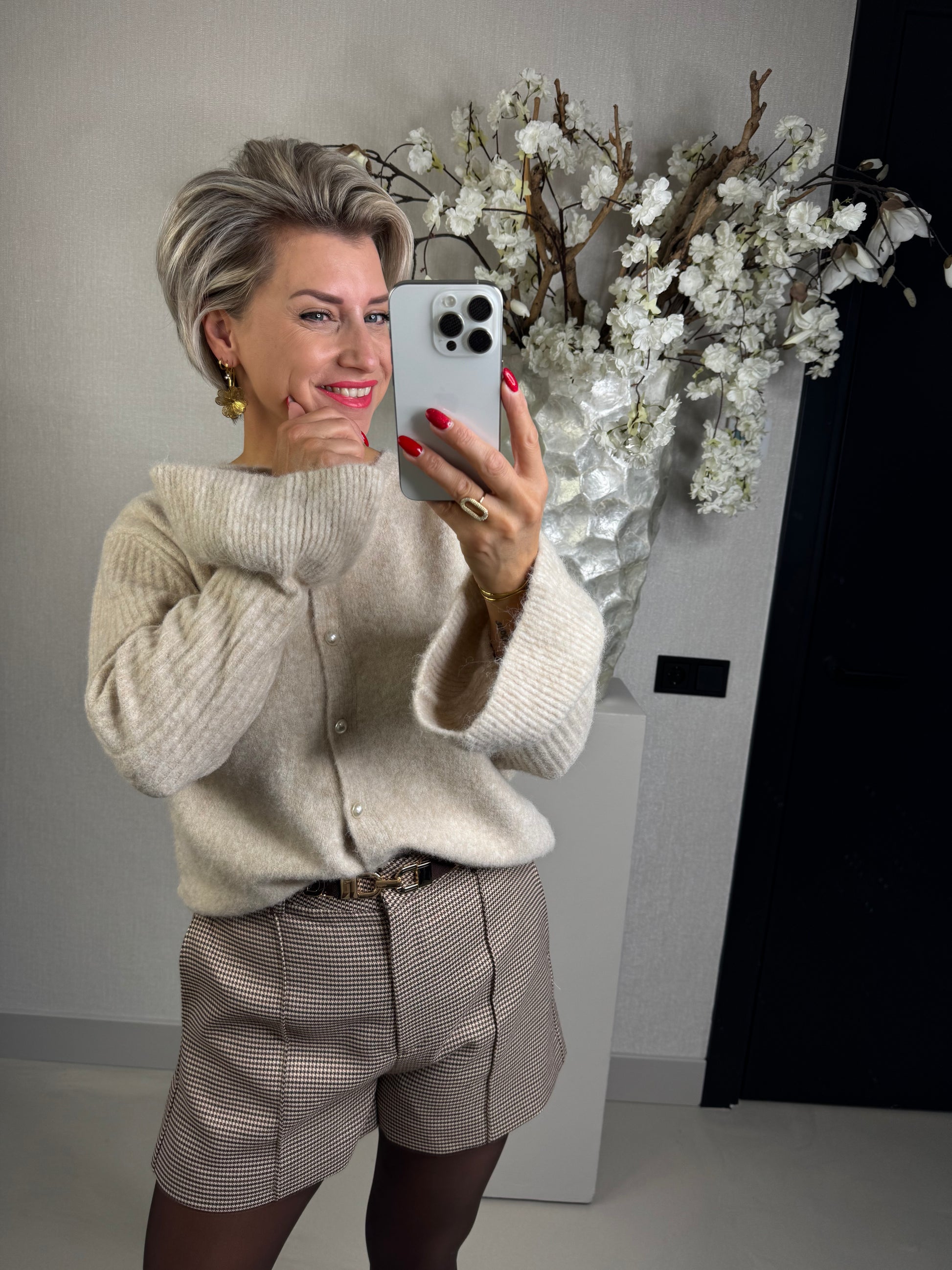 Vest Meike met parelknoopjes en gave details bij de mouwen, het vest is één maat en past tot een maat 42/XL